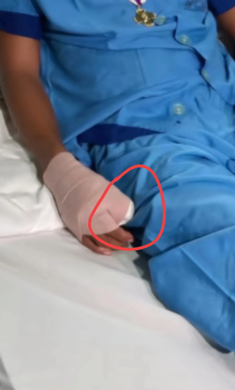 菲律宾参谋长,去医院看望几名受伤士兵,其中一个,右手大拇指断了,断了1/3,整个指甲部位都没了,达到残疾级别了,听说是碰撞时挤压的,其它三人,二人头上裹着纱布,一人鼻梁上贴着纱布,都是轻伤!也不知道这几个人,为什么那么不小心,莫名其妙就受伤了!