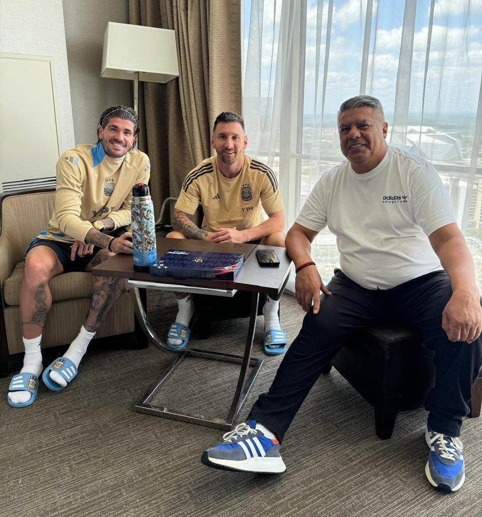 美洲杯揭幕战前,阿根廷足协主席塔皮亚晒与梅西、德保罗的合照: