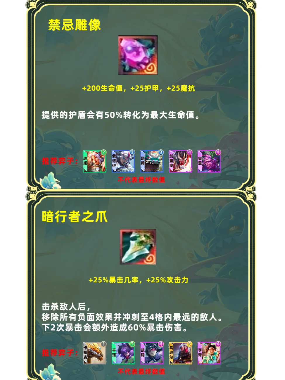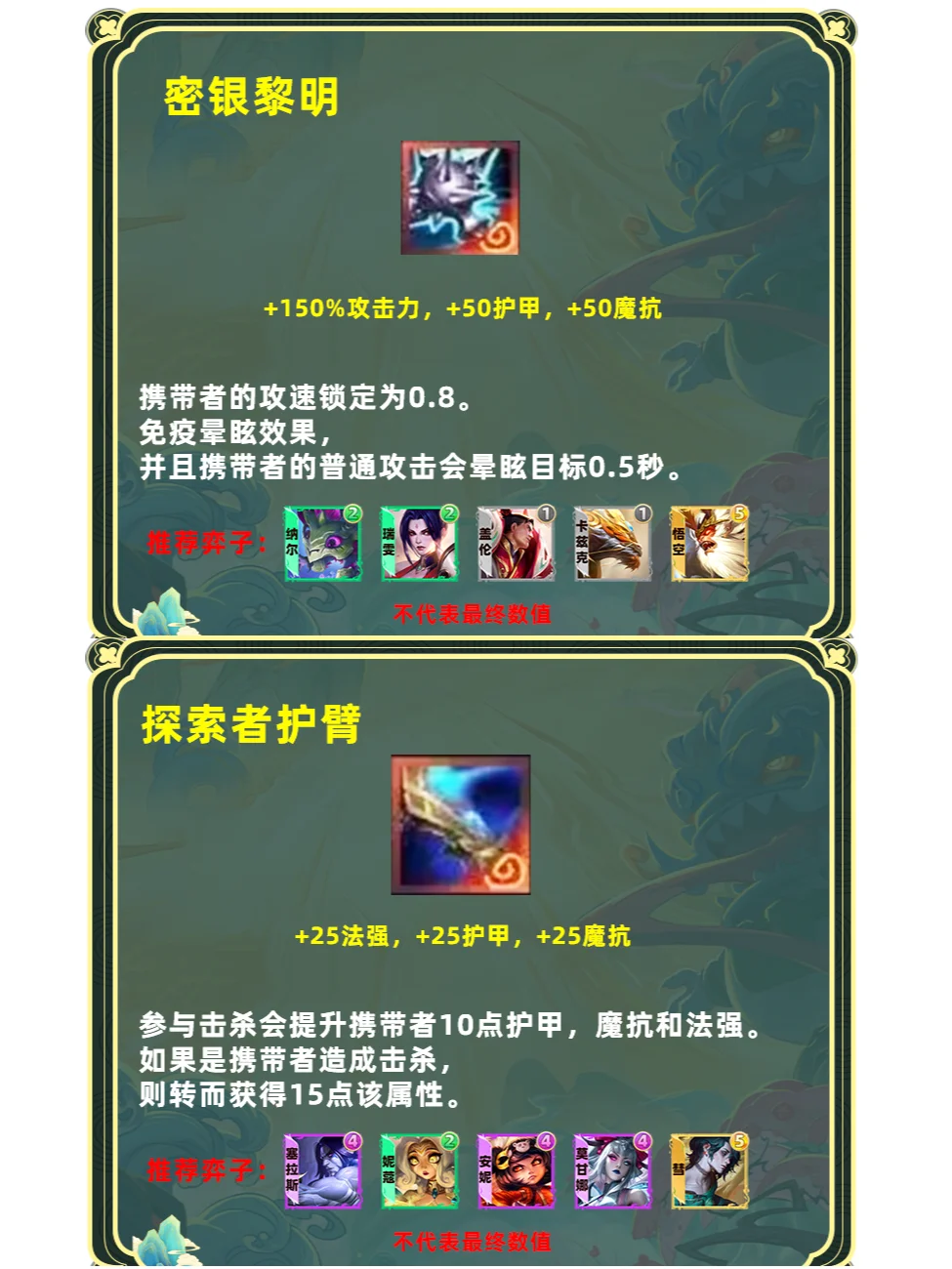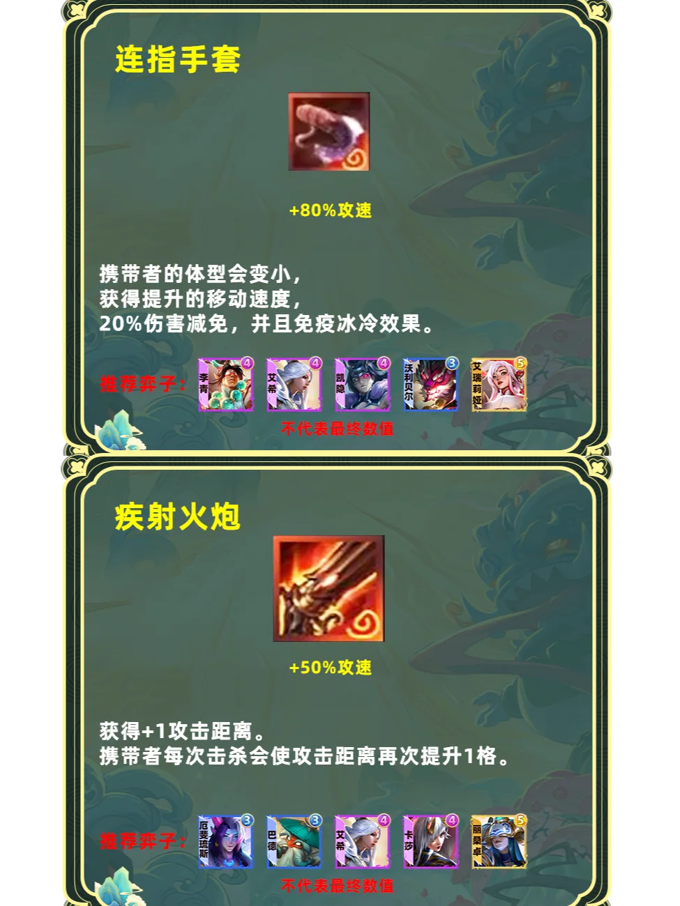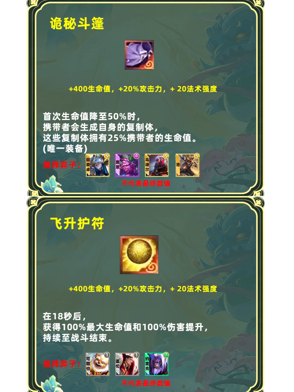 强化版单体飞升。占用一个装备格子,更适合高坦度但缺少输出的棋子,推荐6护卫盖伦、6斗可酷伯、6擎天卫掘墓,山海妮蔻等专属玩法,这些棋子本身前期要叠属性伤害就不高,刚好与飞升契合。