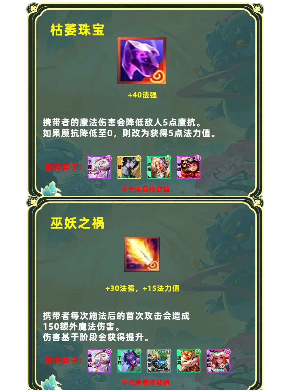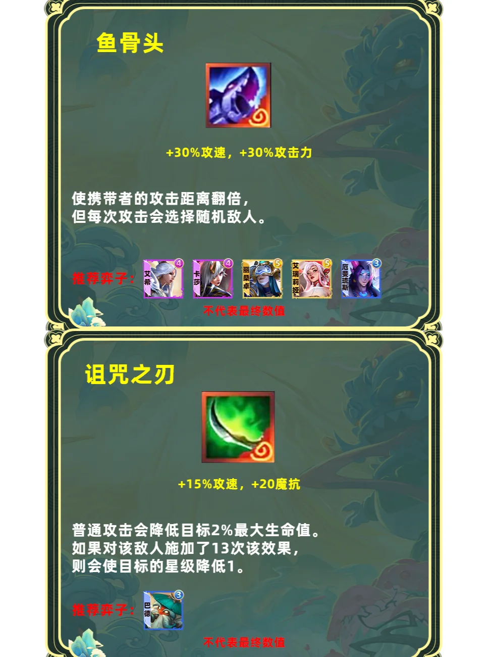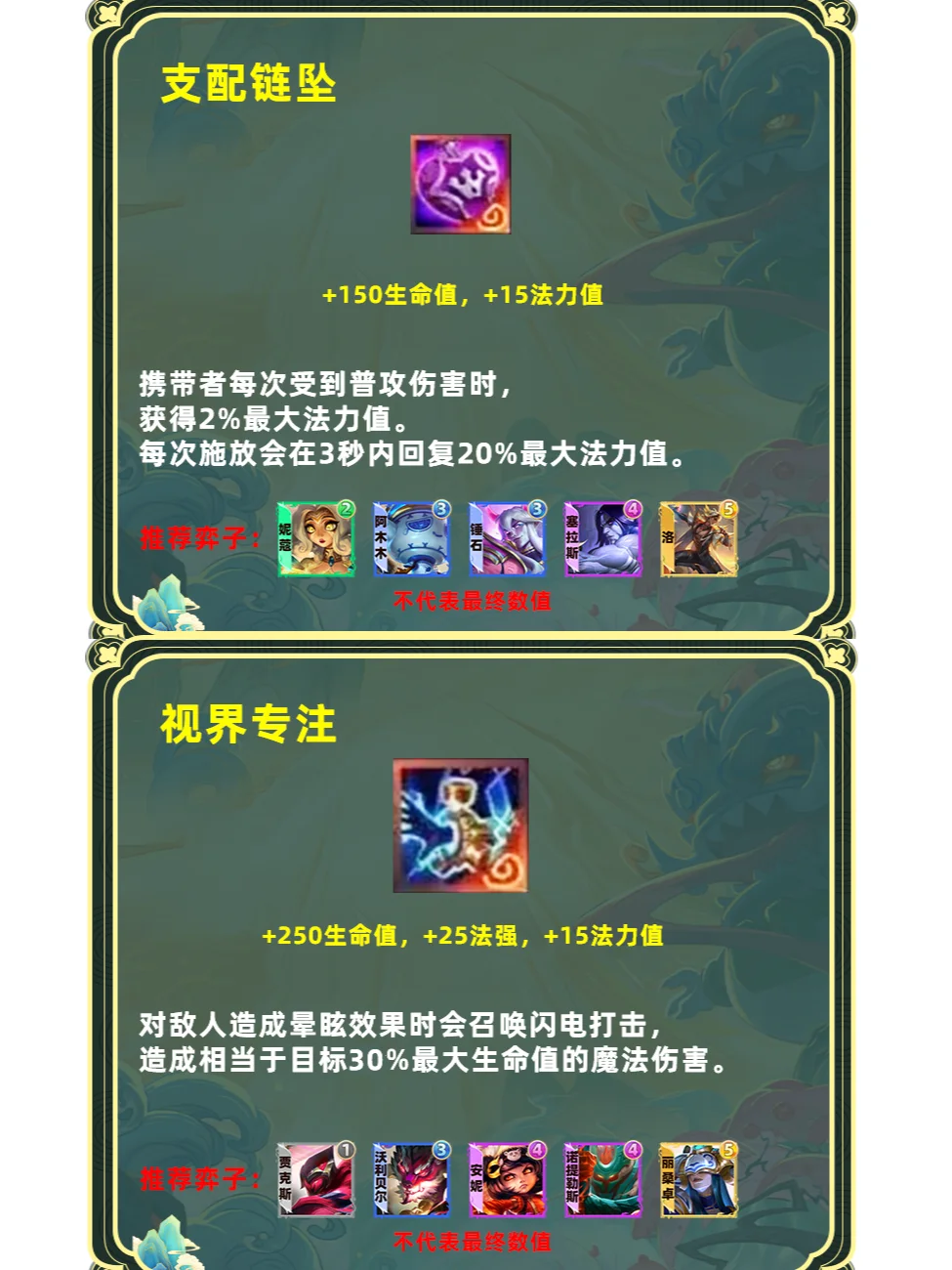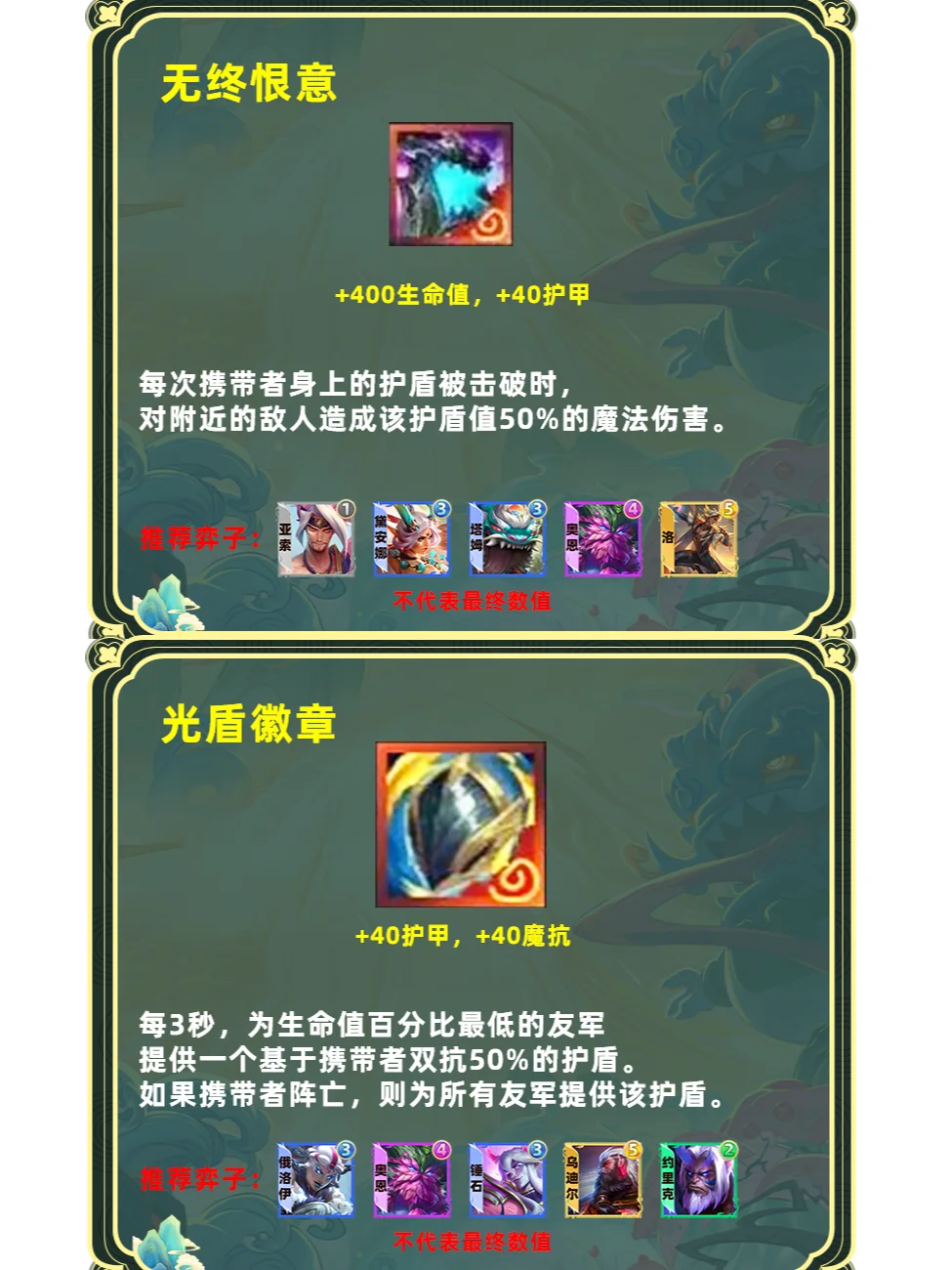强化版单体飞升。占用一个装备格子,更适合高坦度但缺少输出的棋子,推荐6护卫盖伦、6斗可酷伯、6擎天卫掘墓,山海妮蔻等专属玩法,这些棋子本身前期要叠属性伤害就不高,刚好与飞升契合。