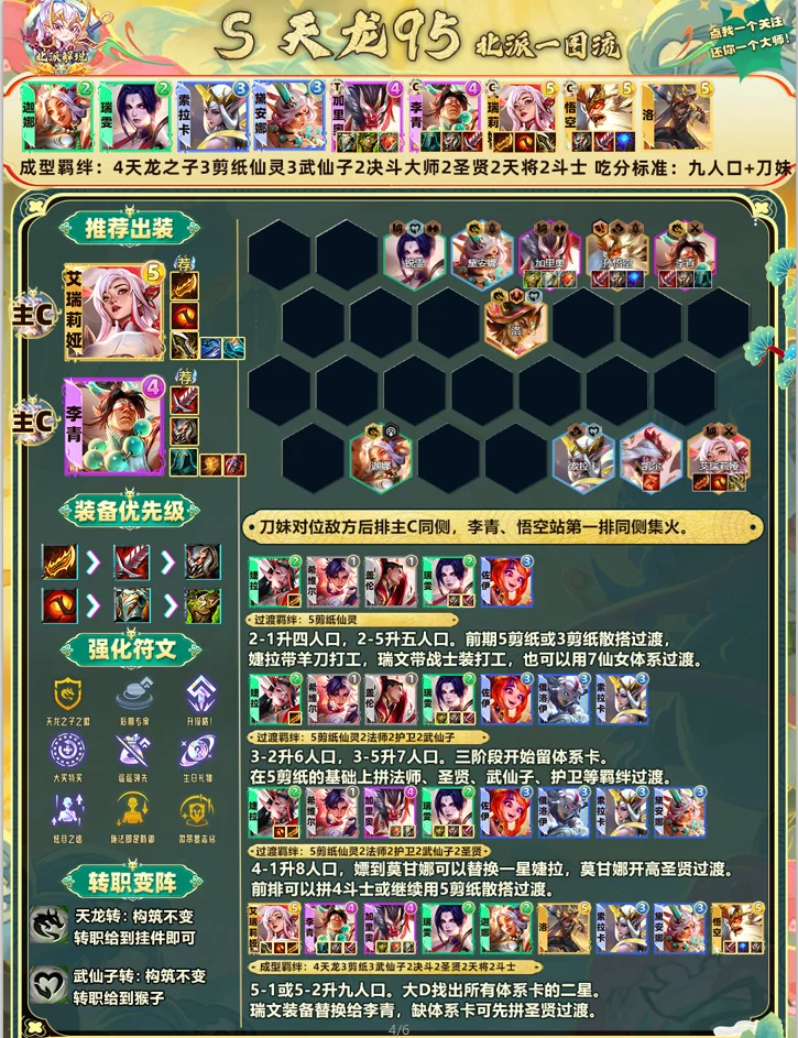 4天龙的落雷眩晕非常克制卡莎、艾希、辛德拉等后排阵容,主C刀妹对位同侧能轻松偷掉后排C位(14.8版本优化了攻击优先级)。这套阵容目前位列T0级,成型后只怕三星四费,唯一难点是过渡到九人口。