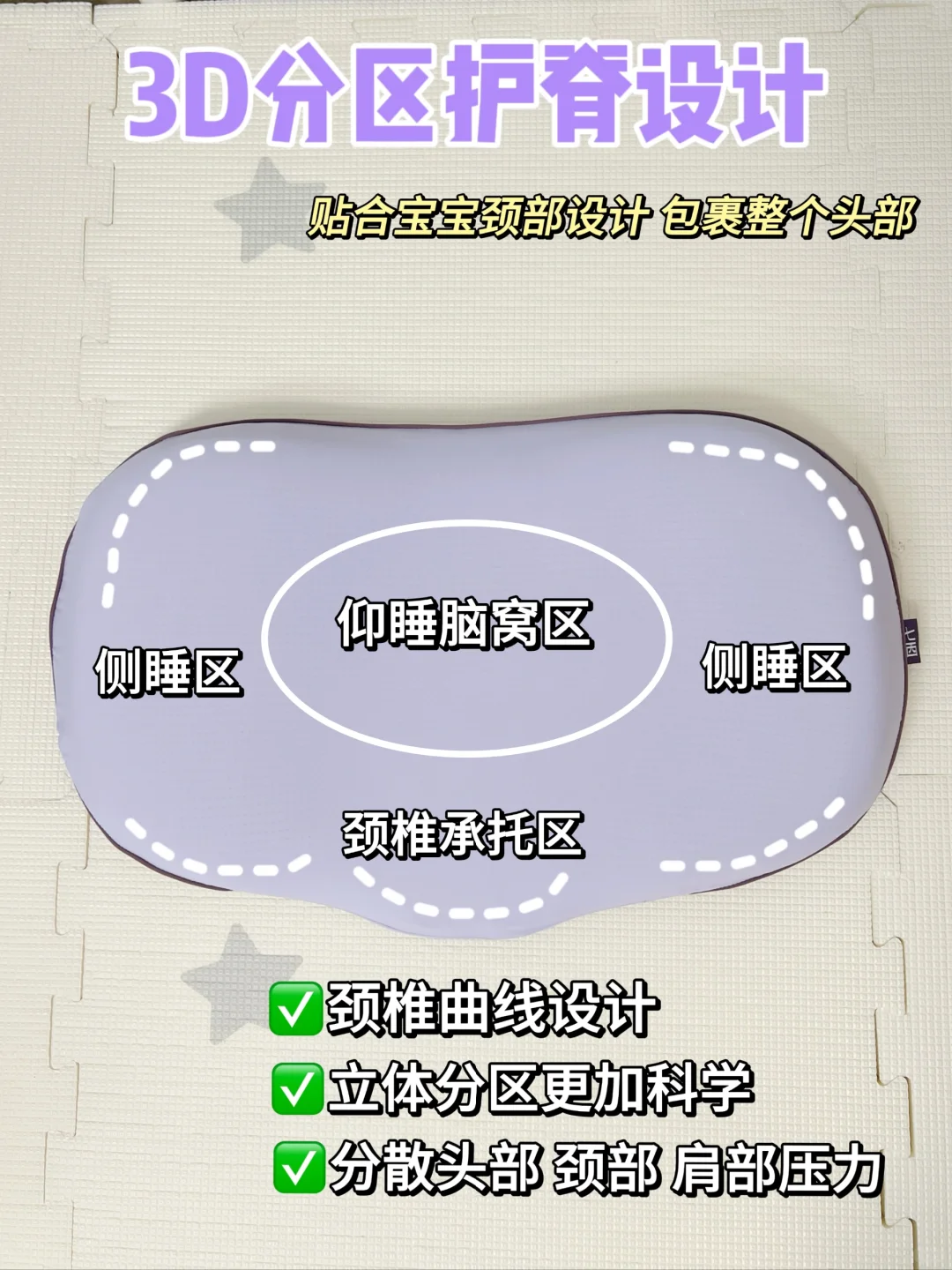 它是做的3D护脊设计,孩子躺下的时候头肩背合一线,贴合度很好。👍它还符合人体工学设计,上边有五大睡眠区,结合孩子生理曲线,不论是仰睡侧睡,都可以找到适合的角度,越睡越舒服。👏加大的枕面任由孩子睡觉怎么狂野翻滚,都能hold住百变睡姿~😝