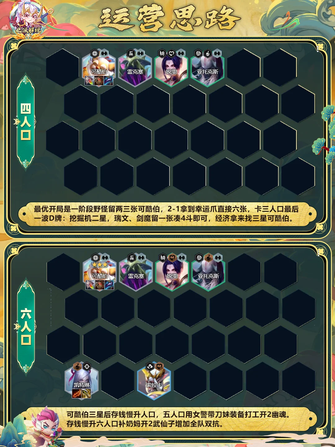 正确玩法是在2-2大D找可酷伯,配合开局白嫖的数量以及幸运爪提供的三张,2-2有20金币在三人口很容易D出三星,即使还差一两张没有三星,那么D到4斗士也能保持阵容的强势,帮助可酷伯更好的刷钱。差一两张时继续D干找三星即可,三星后再存钱养可酷伯的被动。