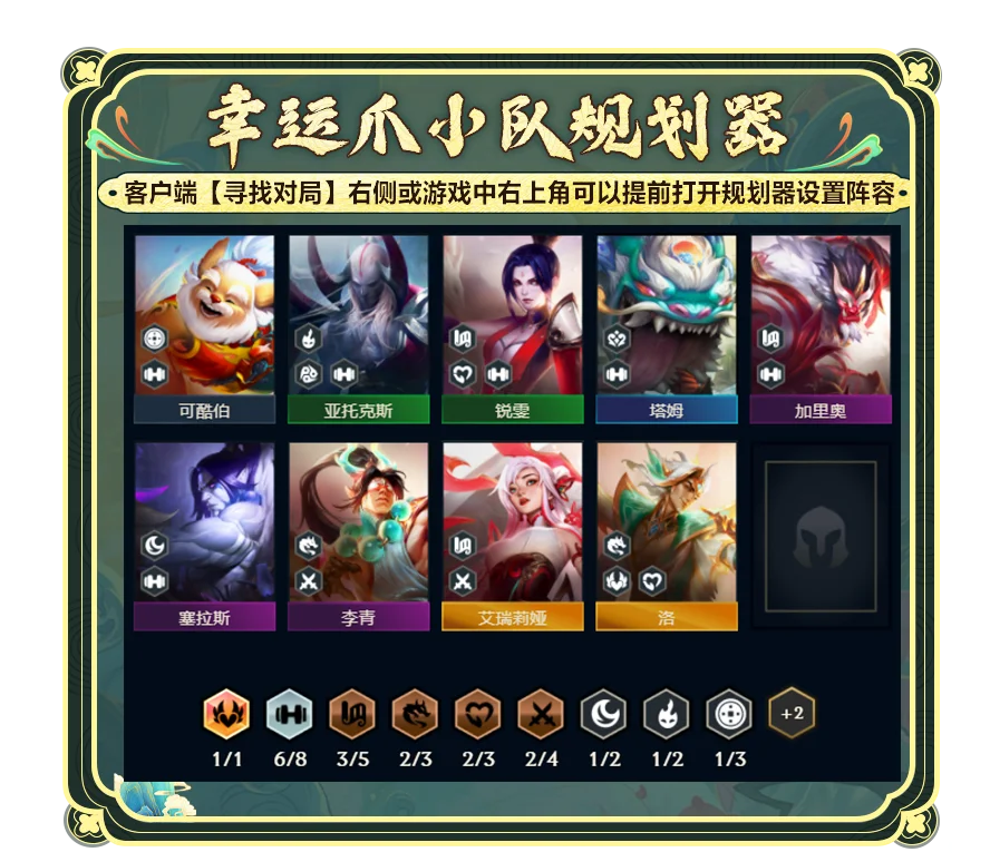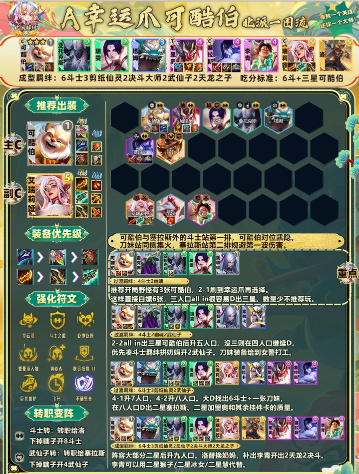 幸运爪的玩法核心是依靠高质量可酷伯前期打连胜刷金币,快速升九找二星五费来C(单玩可酷伯后期C不了)。