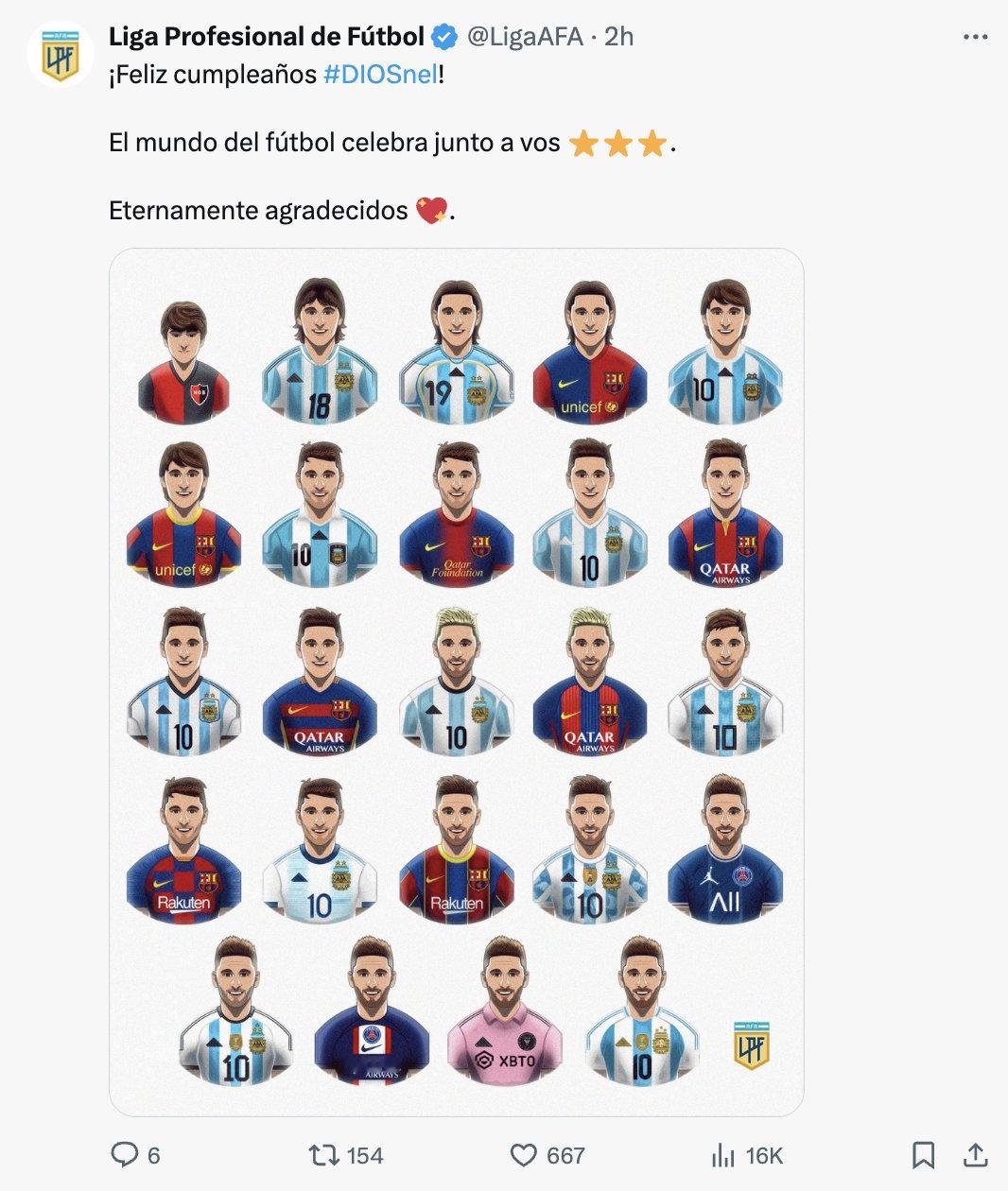 “生日快乐,DIOSnel!(上帝DIOS和 Lionel 合并)足球世界与你同庆,永远感激。”