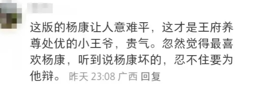 这部新版射雕开播,就有人把新版杨康和83版杨康拿出来比,本来一代有一代的审美,无可厚非,很正常。