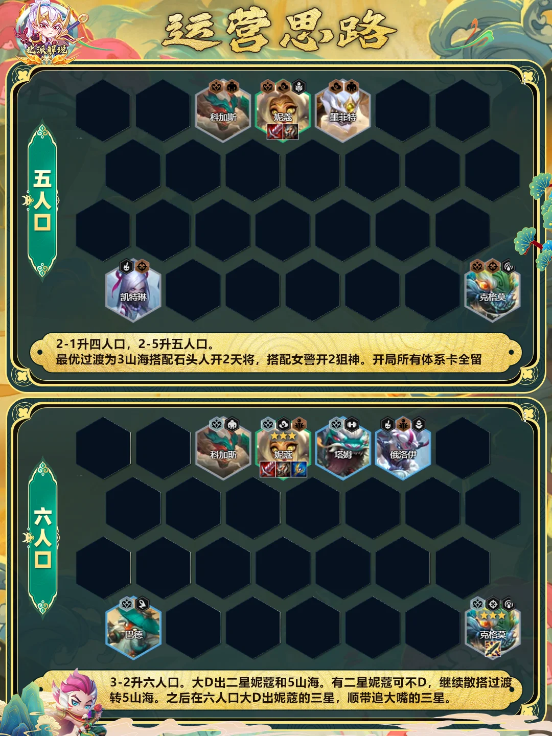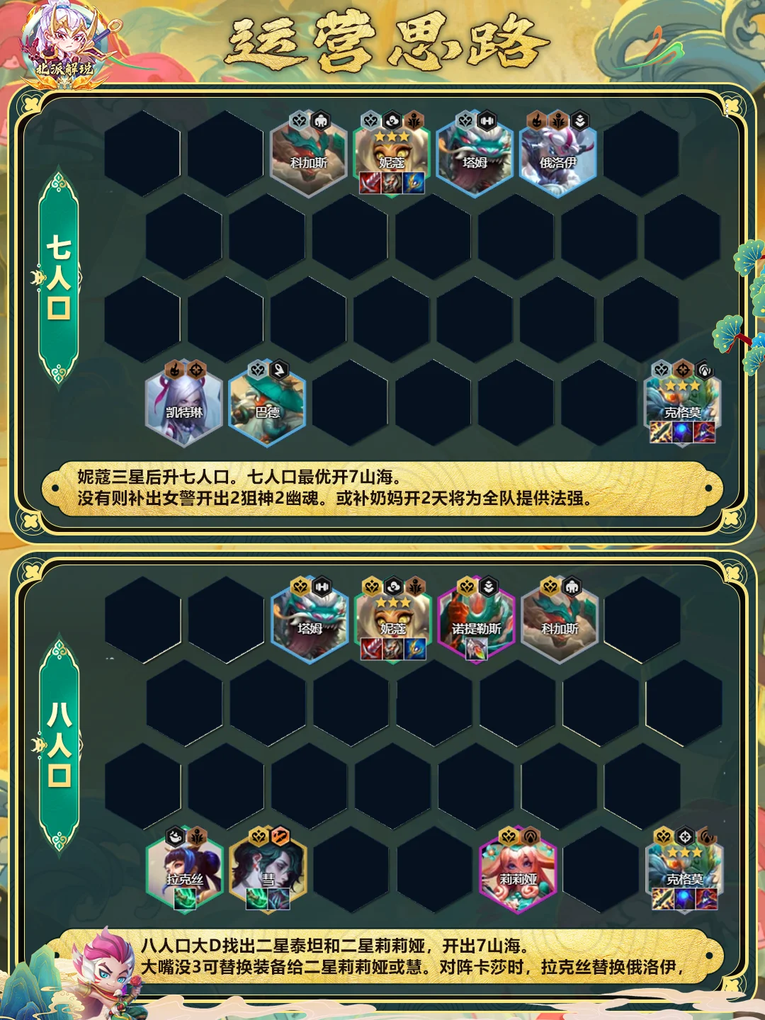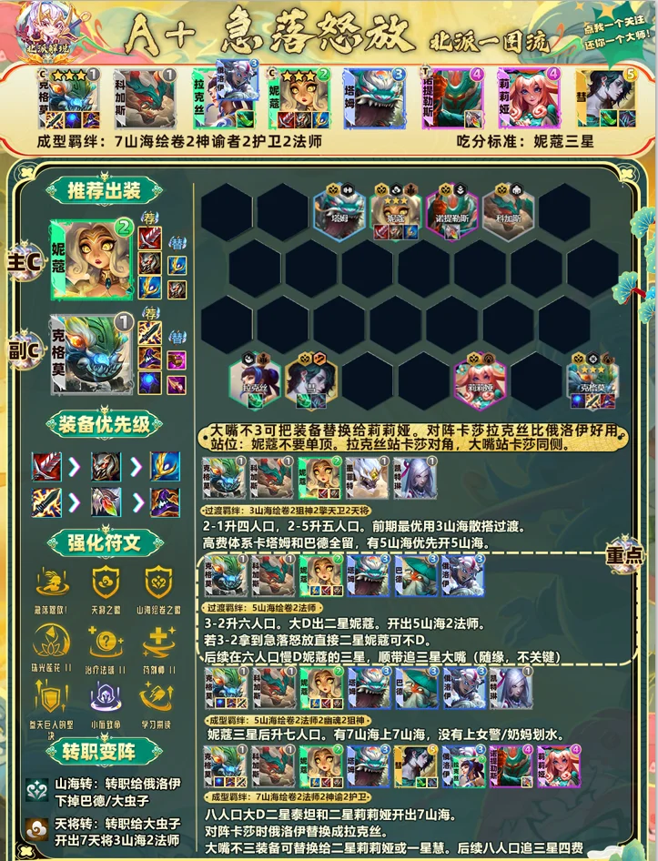 其余构筑玩法:开局确定玩【赌大嘴】或【七仙女】,3-2拿到【急速怒放】后,优先养妮蔻,阵容构筑可不变。2-1拿到【急速怒放】推荐玩高山海。