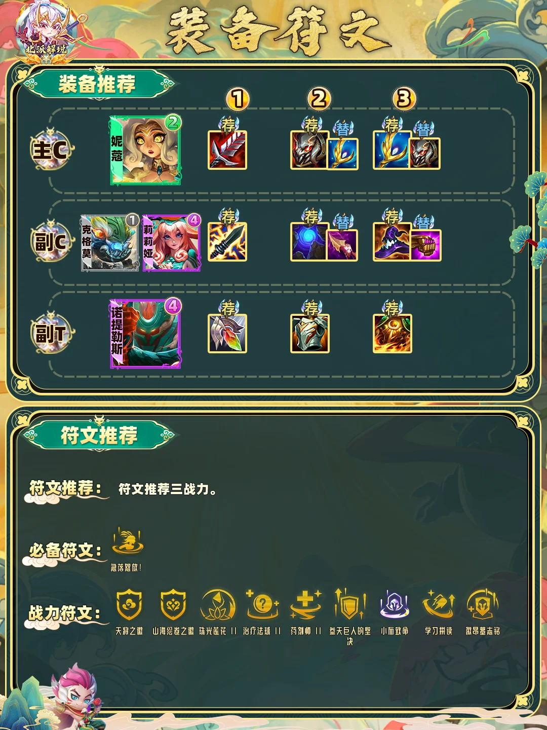 此玩法刚需妮蔻专属符文【急落怒放】。拿到后妮蔻技能的回复量和伤害都会大幅增加,并且每次释放技能都会增加范围。PS:手游比端游地图模型小,第三次释放就可以全屏,这套玩法手游更强势些。