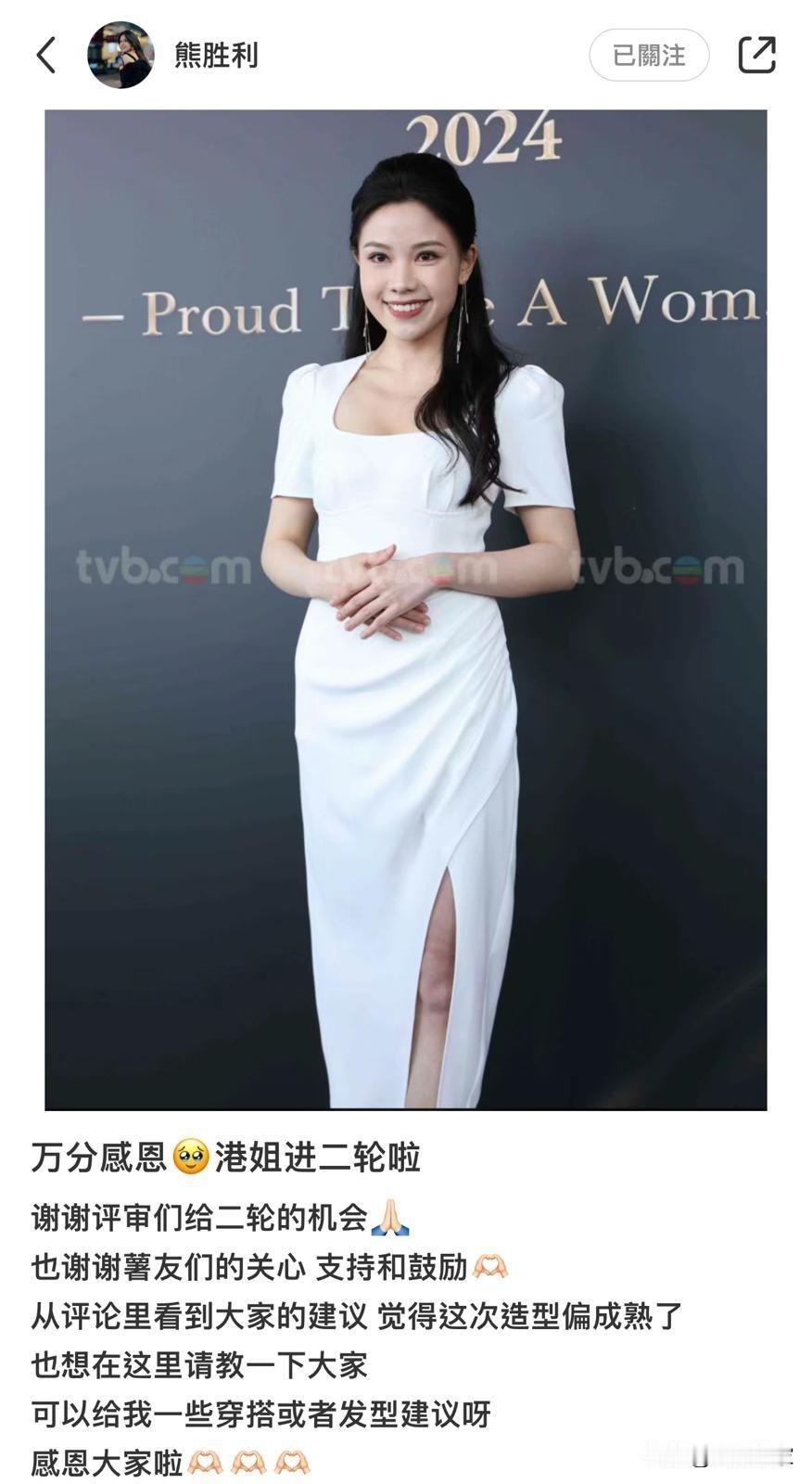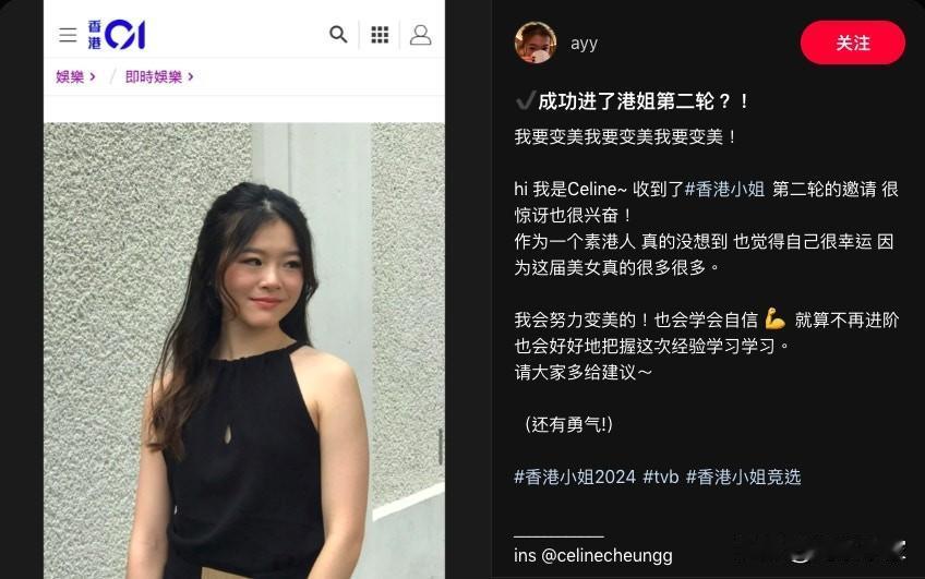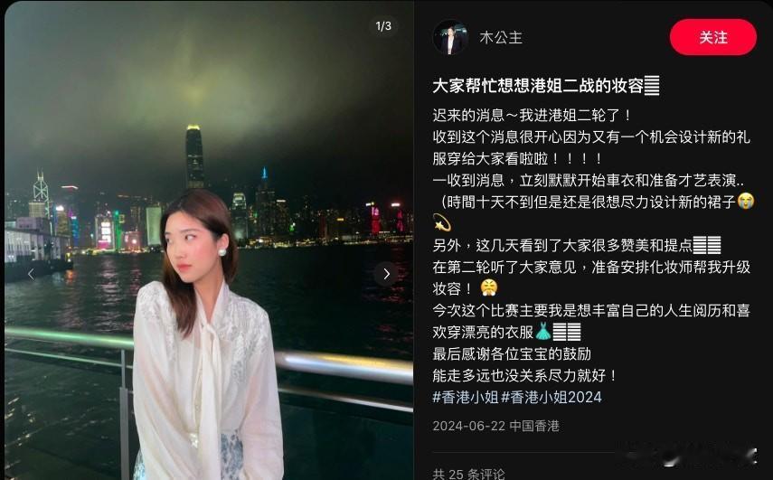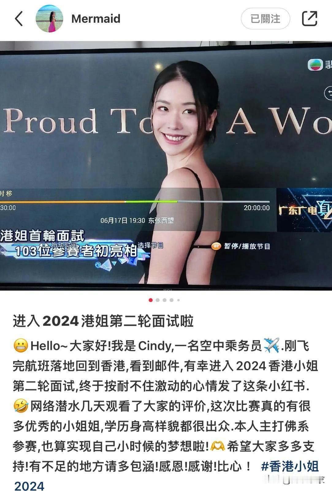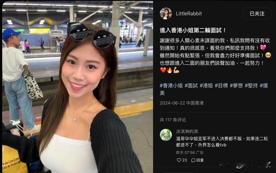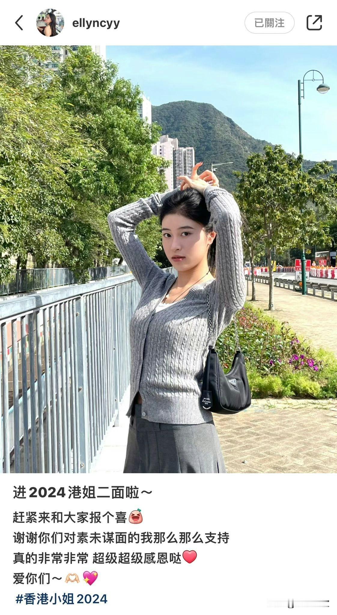 香港小姐2024次轮面试佳丽名单曝光!翻版蔡洁晋级郭佩文劲敌退出 无綫年度选美盛事《2024 香港小姐竞选》首轮面试日前完成,随即成为网民茶余饭後话题;有指第二轮面试将於7月2日进行,但近日已经有不少佳丽「抢闸」,率先在自己社交平台「官宣」进入次轮面试,当中包括被睇高一线的「翻版蔡洁」Dolores、「理工刘颖镟」Lauren林子译、23岁曾在内地做过练习生的Ellyn、拥有健康肤色的梁嘉莹等顺利晋级;而2023华裔小姐亚军Tracy和季军Annie则由温哥华斗到返香港;来自河南、现就读城市大学的22岁刘沛妍更懒理撞正考试,宁愿辛苦些都不放弃参选;至於首轮面试凭劲爆身材凸「围」而出的郭佩文劲敌丁雨然则宣布:「我退出了」。