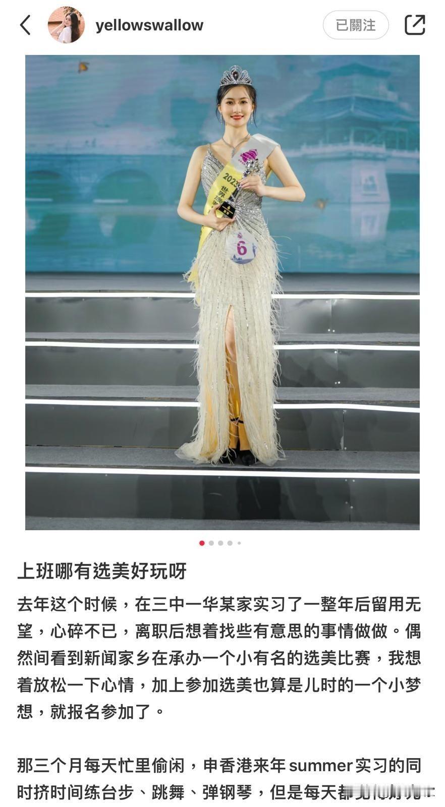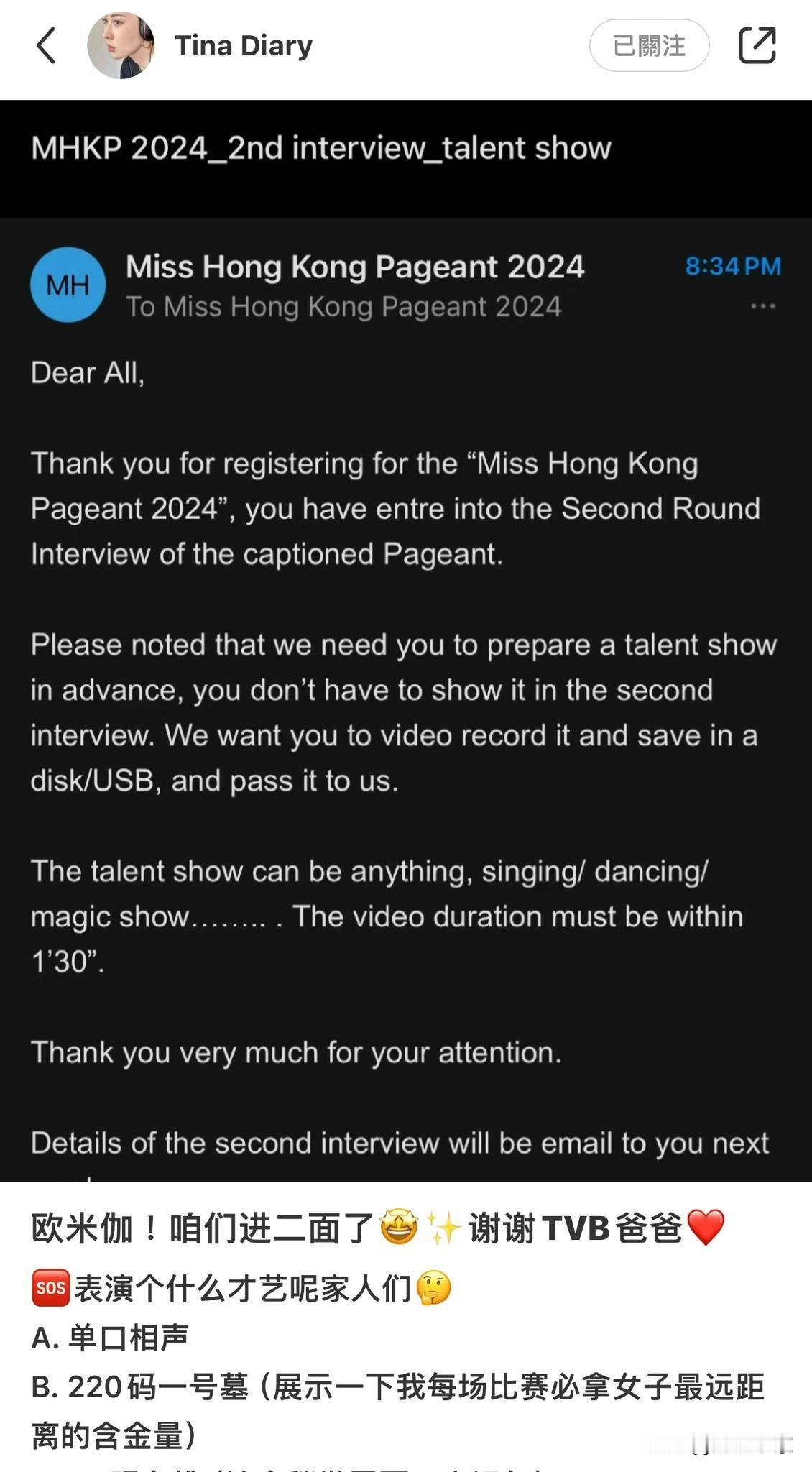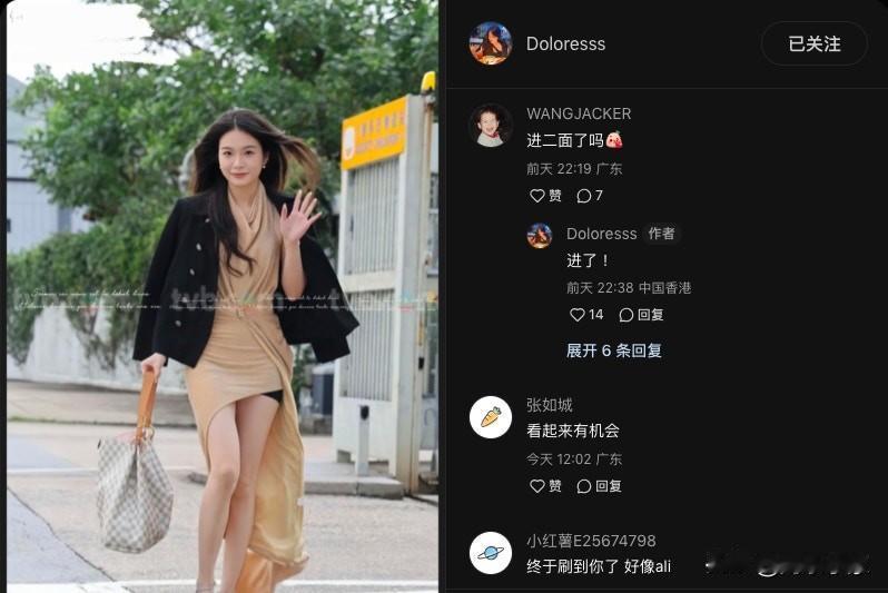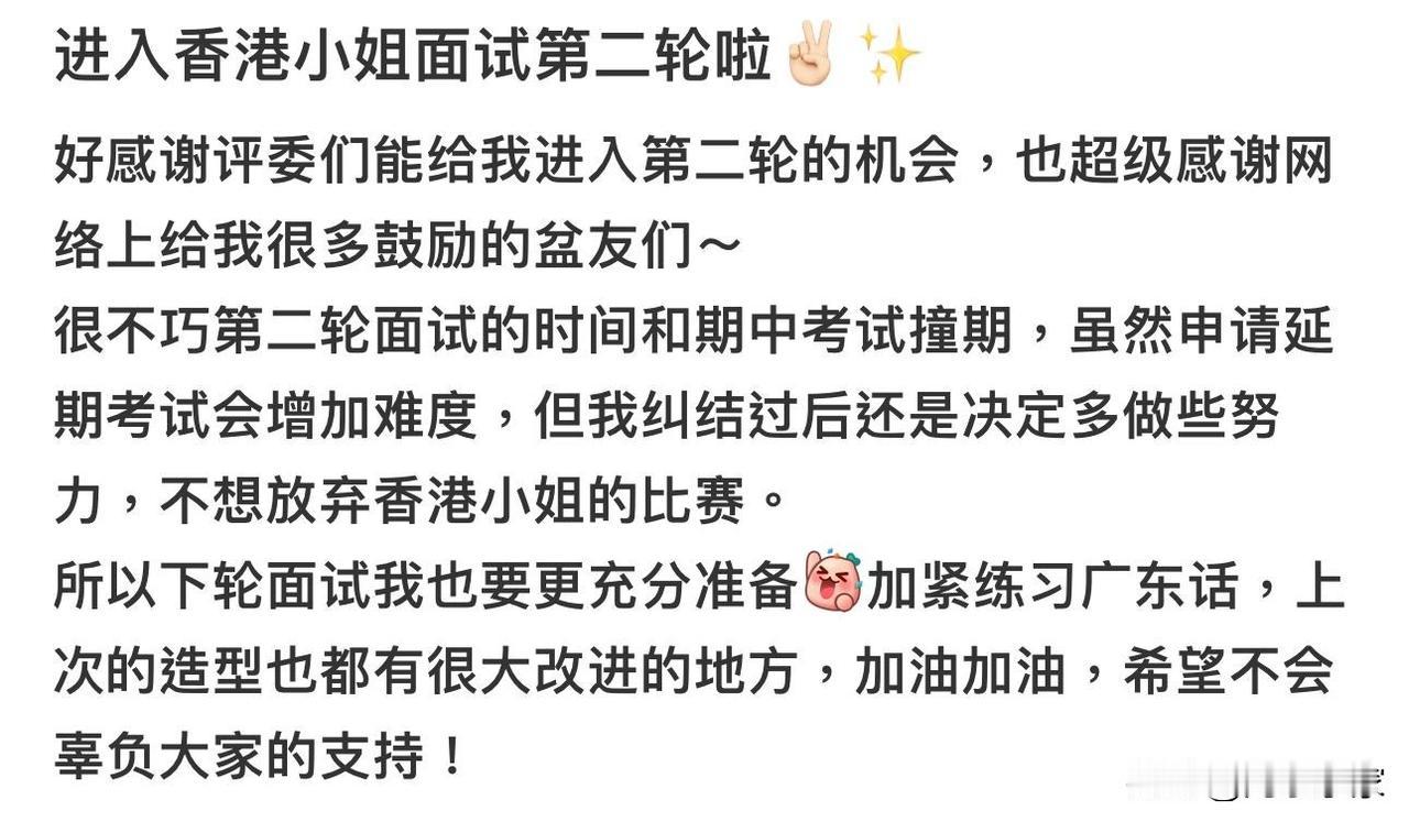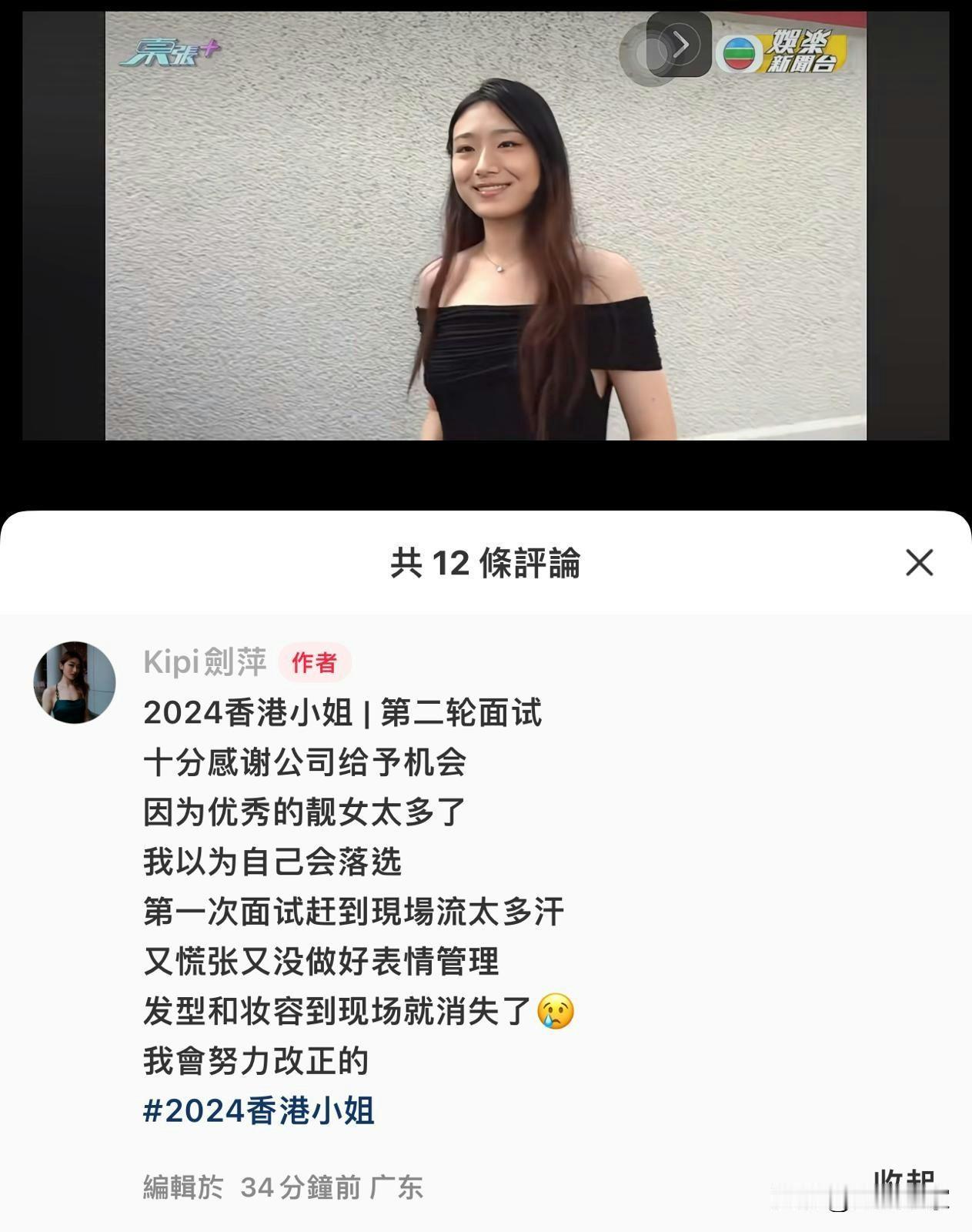 香港小姐2024次轮面试佳丽名单曝光!翻版蔡洁晋级郭佩文劲敌退出 无綫年度选美盛事《2024 香港小姐竞选》首轮面试日前完成,随即成为网民茶余饭後话题;有指第二轮面试将於7月2日进行,但近日已经有不少佳丽「抢闸」,率先在自己社交平台「官宣」进入次轮面试,当中包括被睇高一线的「翻版蔡洁」Dolores、「理工刘颖镟」Lauren林子译、23岁曾在内地做过练习生的Ellyn、拥有健康肤色的梁嘉莹等顺利晋级;而2023华裔小姐亚军Tracy和季军Annie则由温哥华斗到返香港;来自河南、现就读城市大学的22岁刘沛妍更懒理撞正考试,宁愿辛苦些都不放弃参选;至於首轮面试凭劲爆身材凸「围」而出的郭佩文劲敌丁雨然则宣布:「我退出了」。