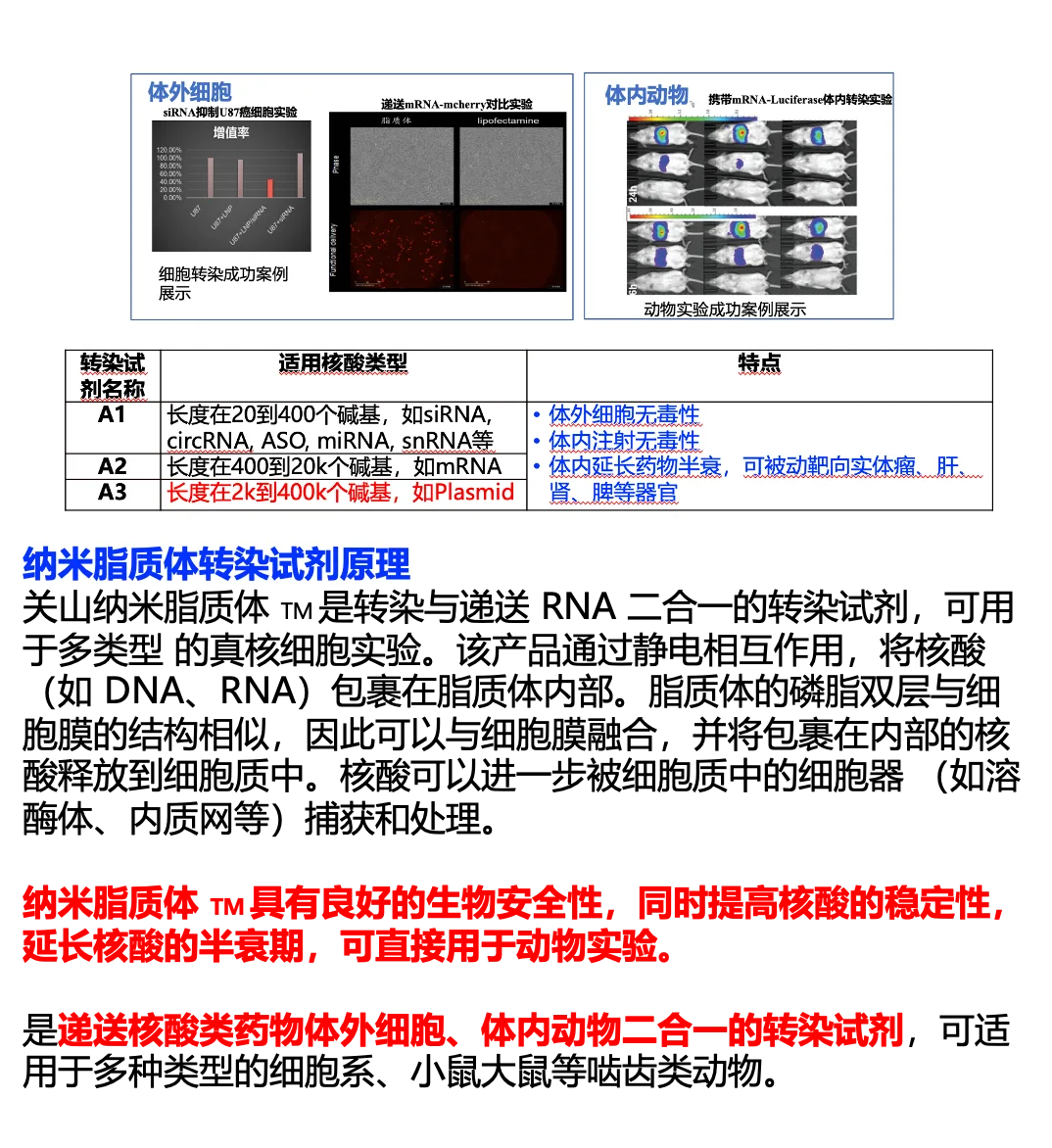 ✅4、可尝试使用纳米脂质体转染试剂,近些年的后起之秀,转染效果不比lipo差,且基本无毒性,zui主要的是可以直接进行体内动物实验,且好多文献已经有报道相关动物实验的数据资料~图578有介绍。