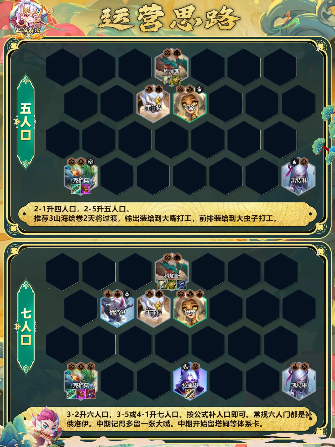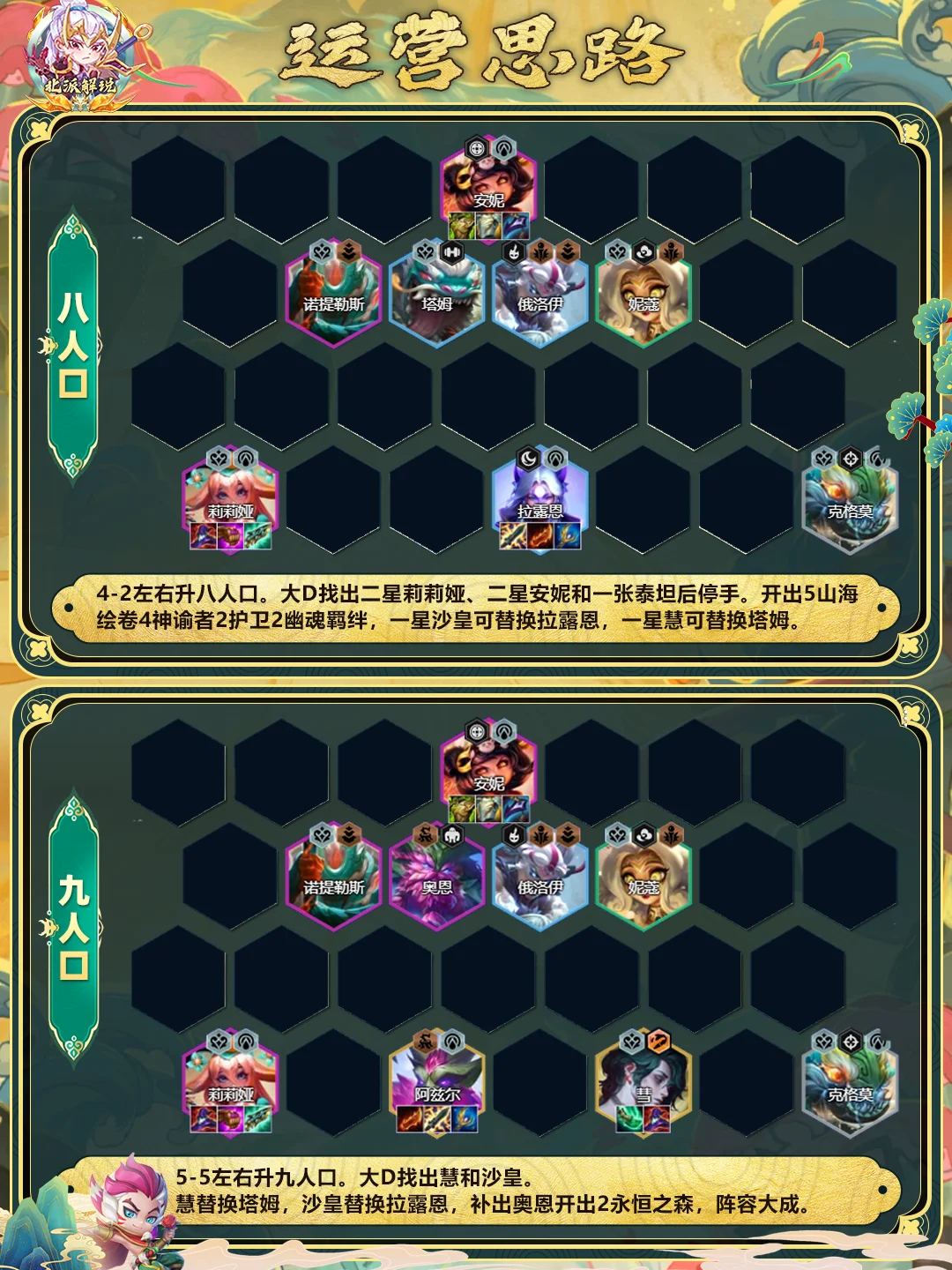 这是一套8D运营阵容,推荐在开局糊法系装备时选择;也可作为玩95运营不到九人口的跑路阵容。在九人口补充沙皇与慧后可与常规95一战。