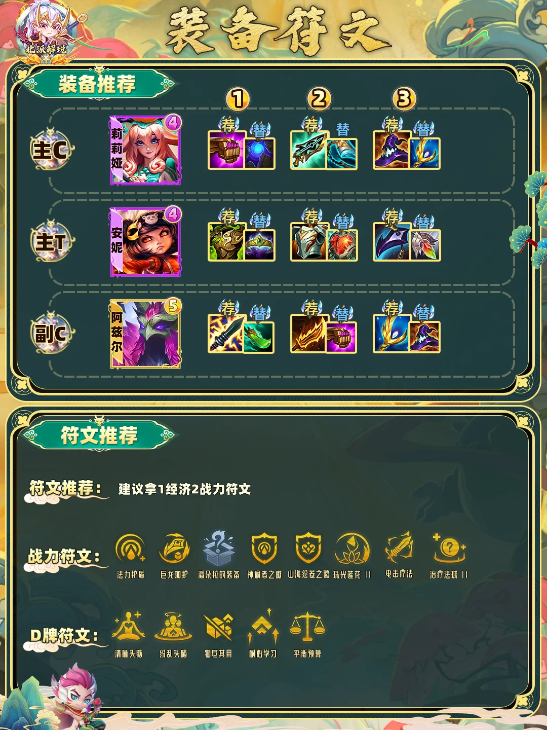 战力符文:【法力护盾】【巨龙加护】【潘朵拉的装备】【神谕者之徽/冕】【山海绘卷之徽/冕】【珠光莲花】【电击疗法】【治疗法球】