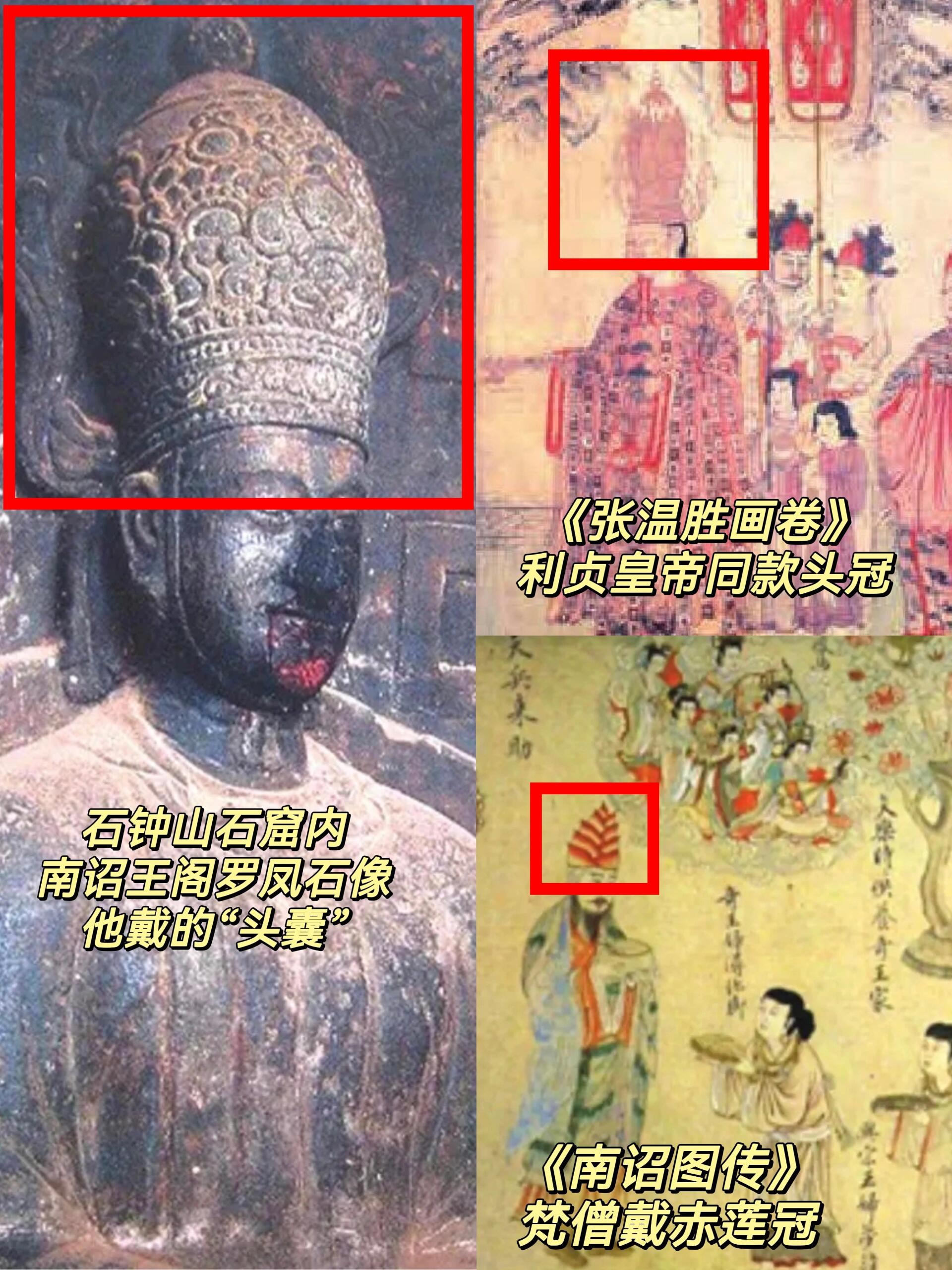 据说南诏国这种头冠与吐蕃佛僧戴的“缠头”有渊源,谁让他们离那么近呢。而且南诏作为小国,当时夹在吐蕃和大唐之间,左右称臣,文化自然会受到影响吧。