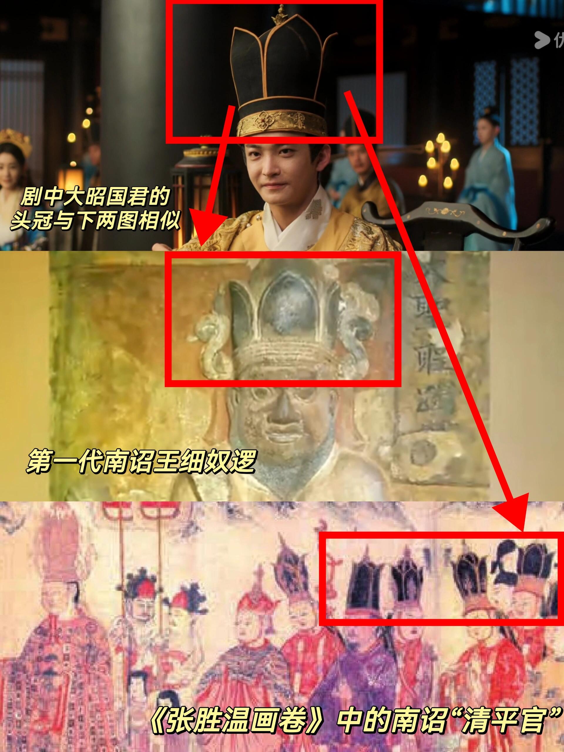 剧中大昭国大臣的头冠可以直接从《张胜温画卷》中找到出处。南诏国称“清平官”,也就是我们说的大臣,戴高的、黑色的、莲花状头冠,而且还有幞头,与剧中很相似。