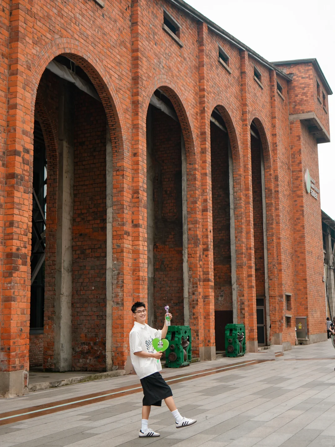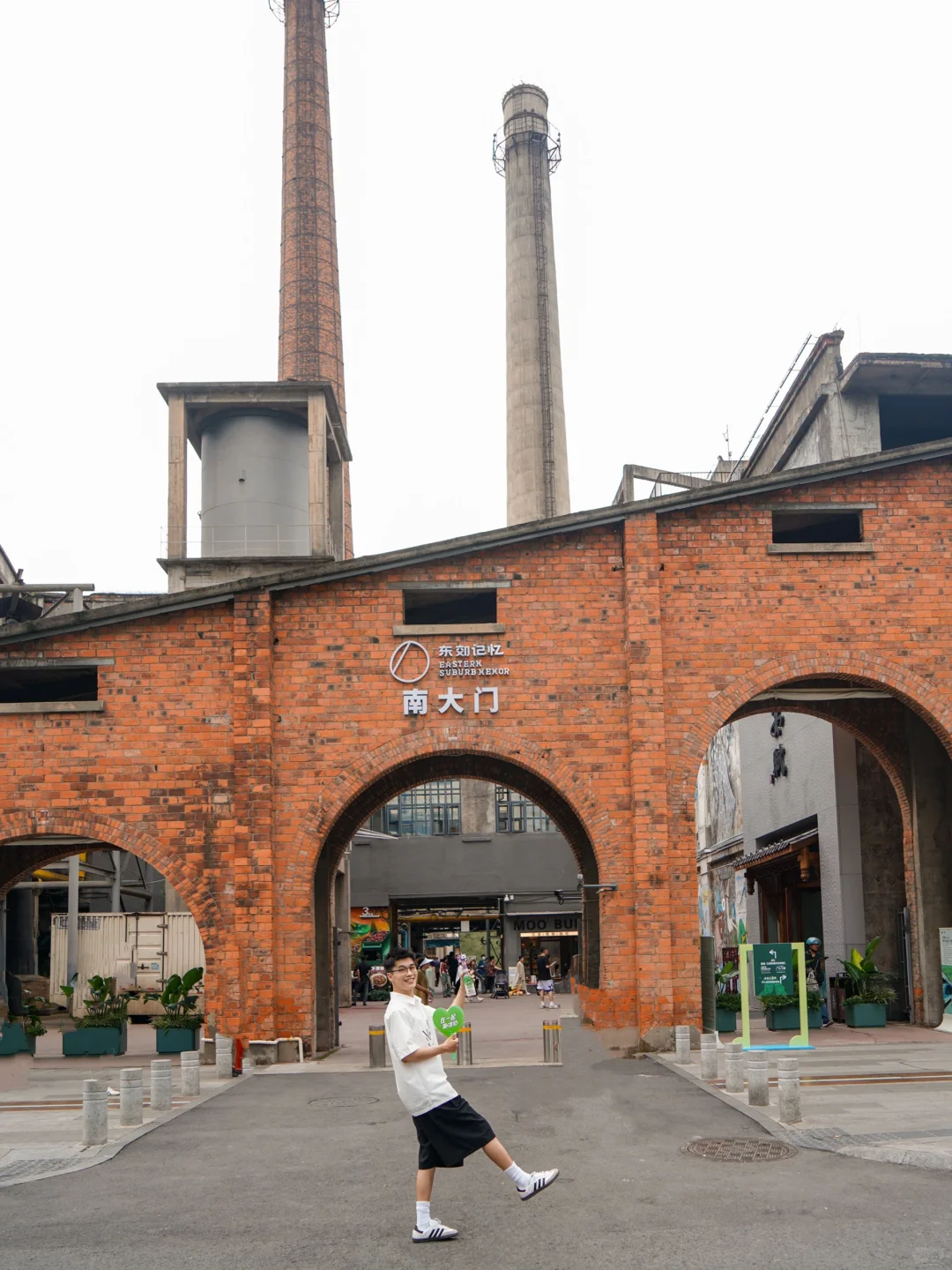 1⃣东郊记忆南大门,红砖砌成的拱门,背景是当时年代保留下来的烟囱,合影一张很有纪念意义。