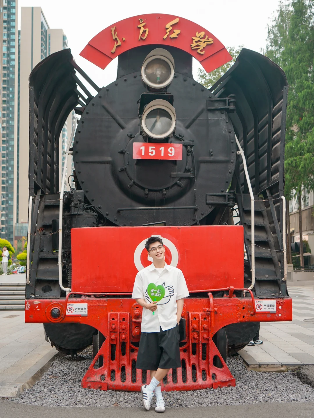 3⃣火车头广场,这里停靠了一辆绿皮火车,车身很出片之外,东方红号火车头也不能错过。