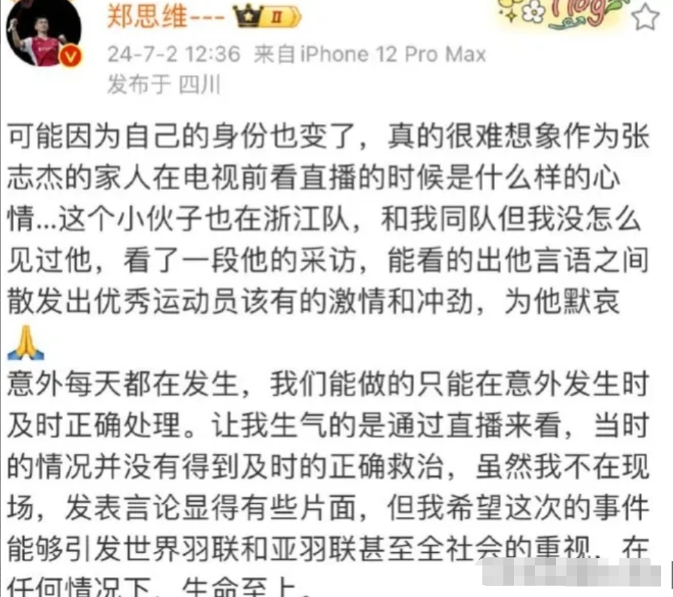 郑思维在微博上写到: 可能因为自己的身份也变了,真的很难想象作为张志杰的家人在电视前看直播的时候是什么样的心情…这个小伙子也在浙江队,和我同队但我没怎么见过他,看了一段他的采访,能看的出他言语之间散发出的优秀运动员该有的激情和冲劲,为他默哀………