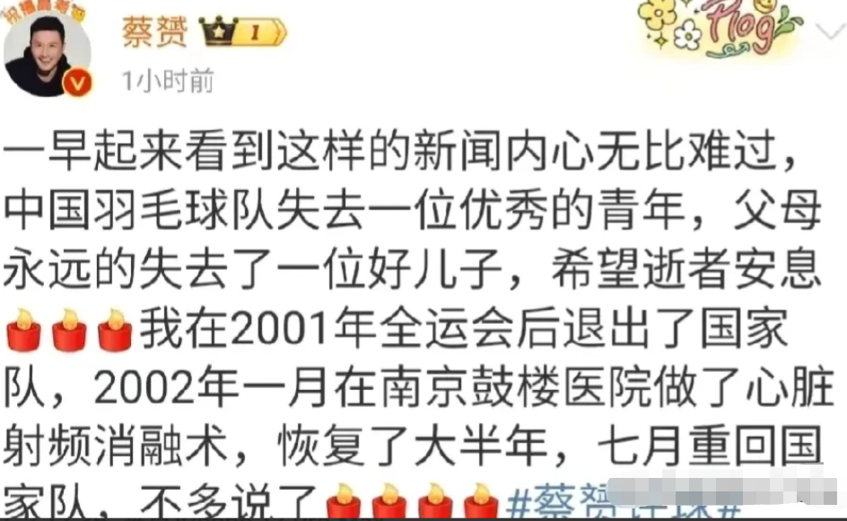 蔡赟在微博上写到: 看到这样的新闻内心无比难过,中国羽毛球队失去一位优秀的青年,父母永远的失去了一位好儿子,希望逝者安息………