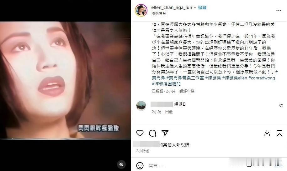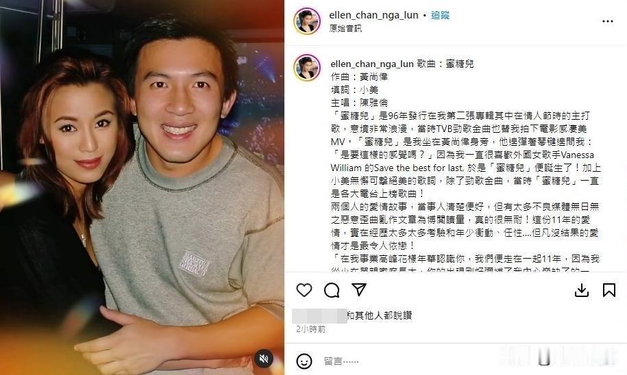 58岁陈雅伦再向前度示爱 自爆分手原因:没结果的爱情最令人依恋 现年58岁的80年代性感女星陈雅伦日前突然在社交平台晒出与名监制旧爱黄尚伟的早年合照,更称至今忘仍不了对方:「今年是我们分手第24年了,我一直以为自己可以放下你,但原来我做不到!」昨日(3日)陈雅伦再度发文自爆当年分手原因,还再度公开说:「你永远是我人生最美的回忆!」 陈雅伦再发文自爆当年与黄尚伟分手原因,还忆述黄尚伟为她度身订造的歌曲《蜜糖儿》的情景:「《蜜糖儿》是96年发行在我第二张专辑其中在情人节时的主打歌,意境非常浪漫,当时TVB劲歌金曲也替我拍下电影感凄美MV。《蜜糖儿》是我坐在黄尚伟身旁,他边弹着琴键边问我:『是要这样的感觉吗?』因为我一直很喜欢外国女歌手Vanessa William 的Save the best for last, 於是《蜜糖儿》便诞生了!加上小美无懈可击绝美的歌词,除了劲歌金曲,当时《蜜糖儿》一直是各大电台上榜歌曲!」 陈雅伦续写道:「两个人的爱情故事,当事人清楚便好,这份11年的爱情,实在经历太多太多考验和年少冲动,但凡没结果的爱情才是最令人依恋!」其後陈雅伦自爆当日分手的原因:「在我事业高峰花样年华认识你,我们便走在一起11年,因为我从小在单亲家庭长大,你的出现刚好弥补了我内心崩缺了的一块!但世事往往事与愿违,在经历你父母反对的11年後,我倦了!心淡了!我选择离开了!但这并不表示我不爱你,我想放过自己,给自己人生有个新开始;你永远是我一生最美的回忆!你陪伴我走过人生的高高低低,但最终我们还是分手!今年是我们分开第24年了,一直以为自己可以放下你,但原来我做不到!」 据传媒报道,陈雅伦与黄尚伟分手後,男方在2002年12月与设计师女友Angela结婚,陈雅伦未有获邀出席。陈雅伦当时表示仍爱黄尚伟,并视他为亲人,又指会祝福一对新人,不过在旧爱结婚当晚,陈雅伦被传媒拍下与契姐毛玉萍到跑马地蒲天光,还饮得酩酊大醉。回复单身後,陈雅伦曾表示对爱情没有憧憬,直到2017年突然宣布与吴彦祖表哥Martin婚讯,但公布23天後又宣布分手。