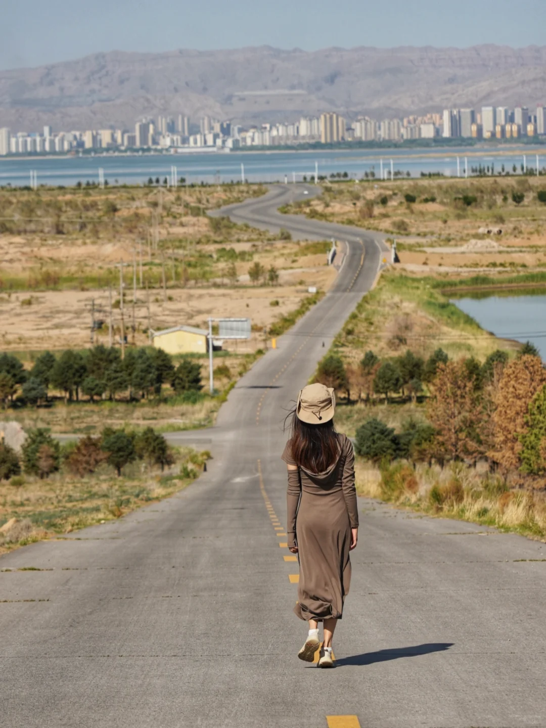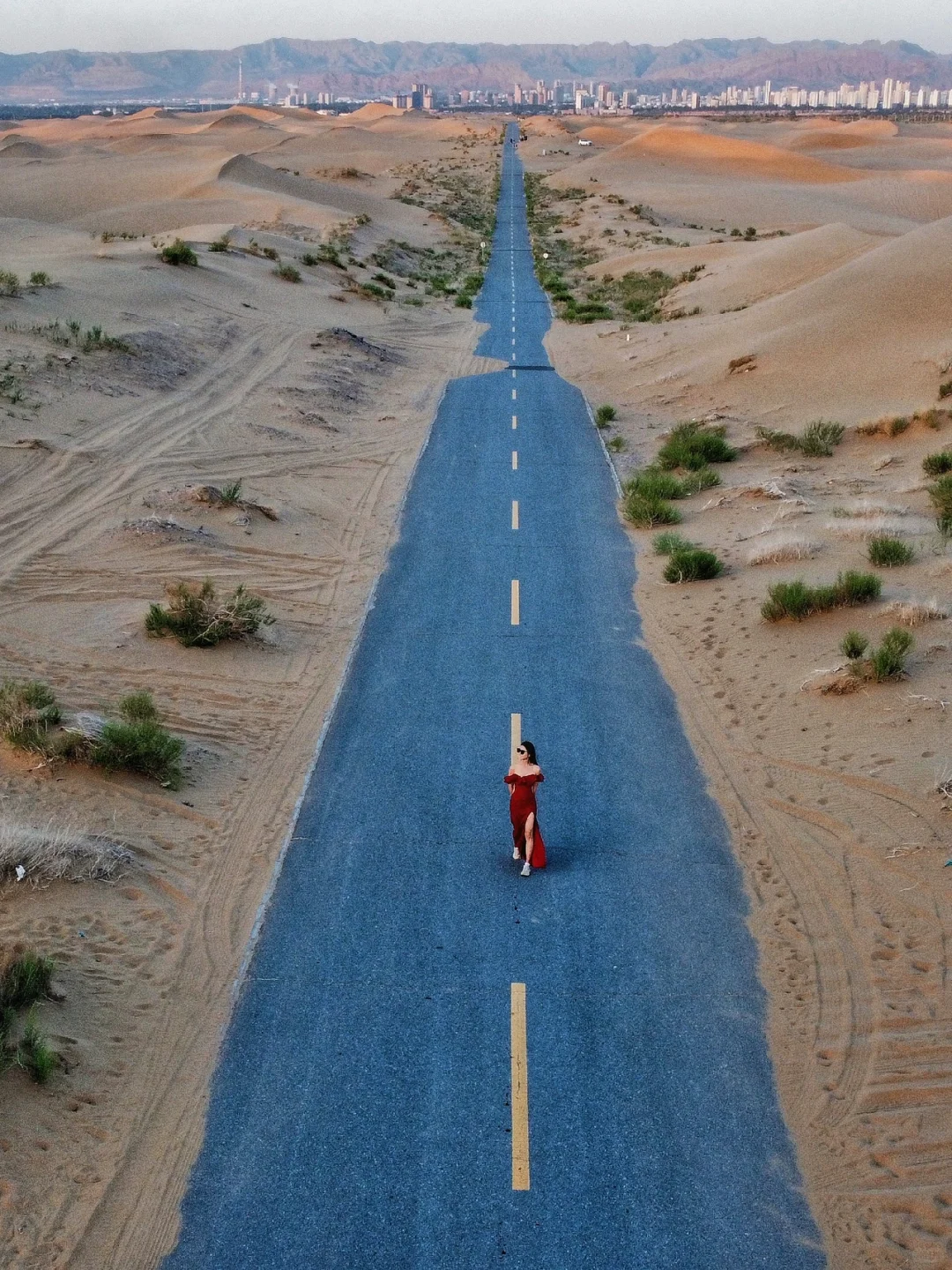 这条公路不通车,可以从乌海湖景区走过去,也可以做越野车进去,无人机拍摄超级震撼,旁边的山丘可以拍到一半沙漠一半海的奇特景观