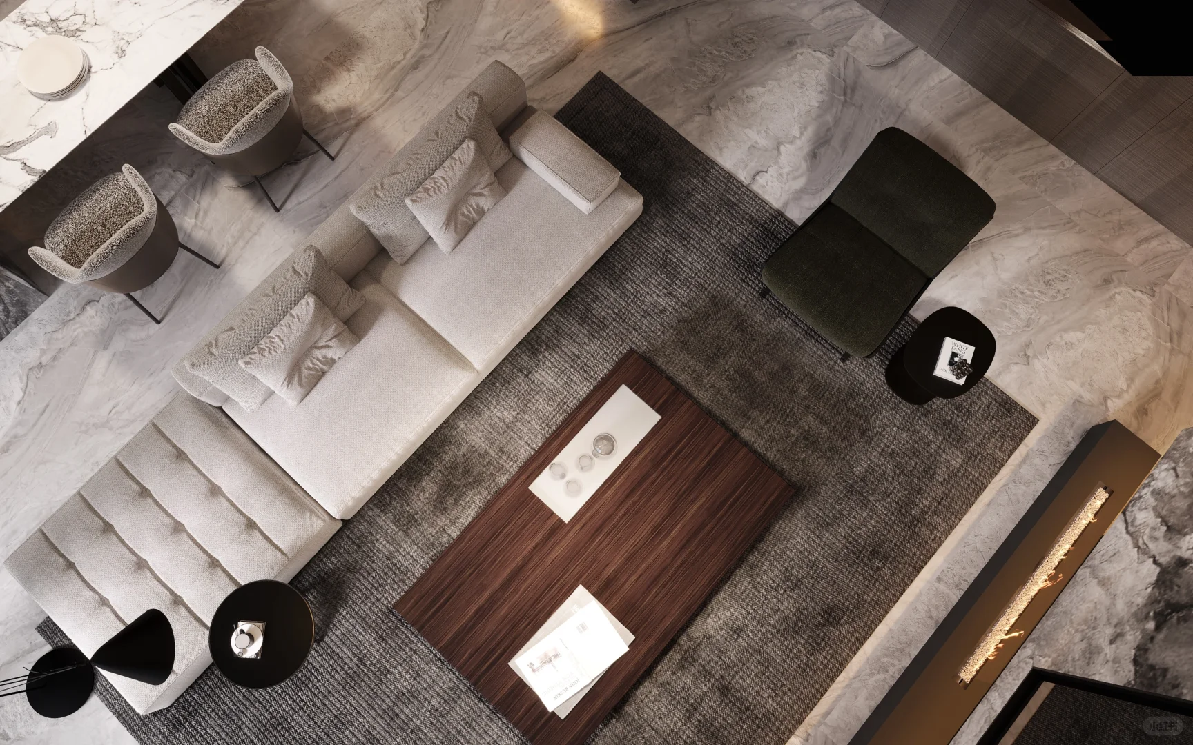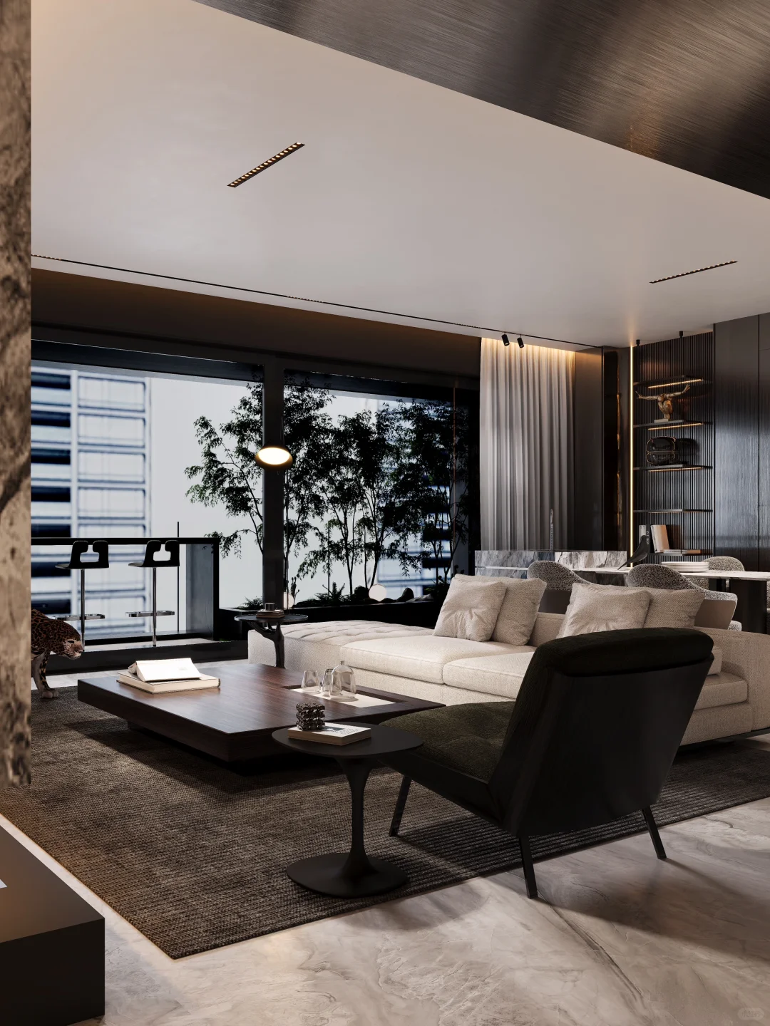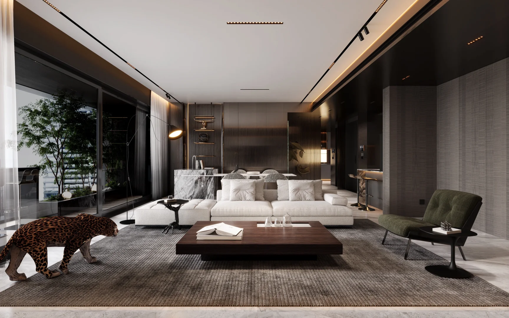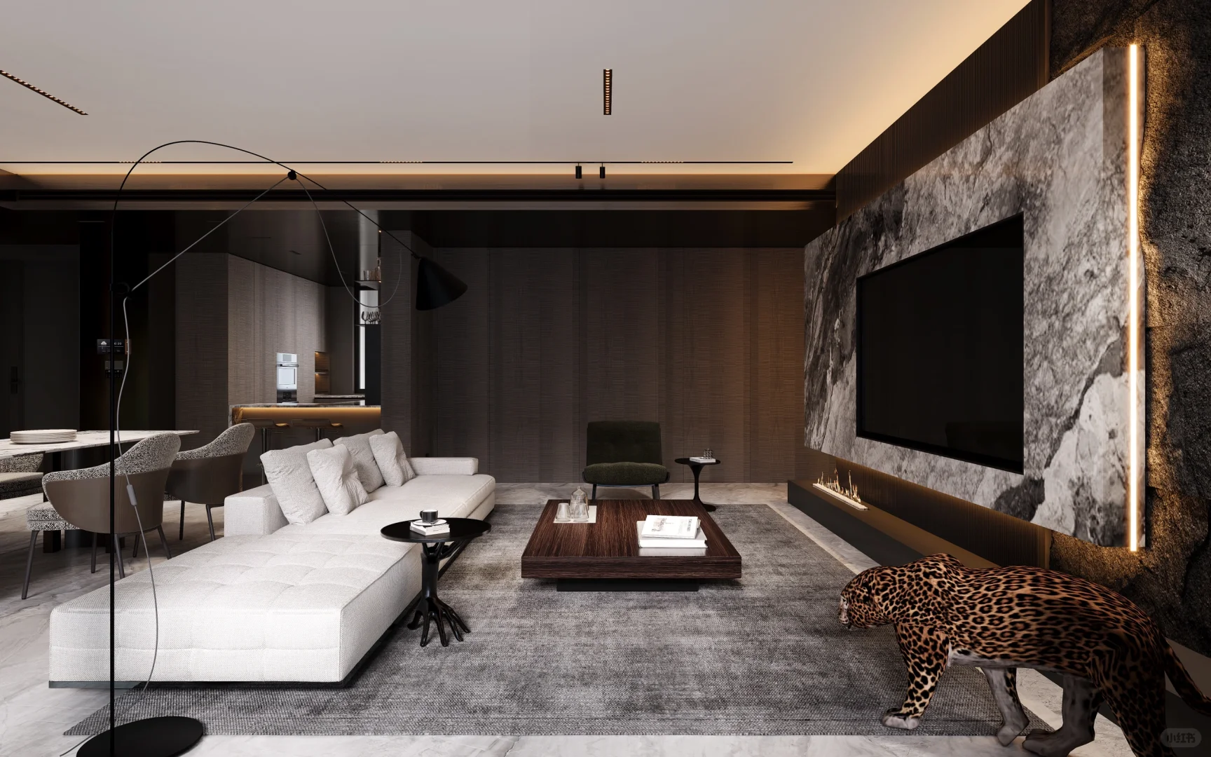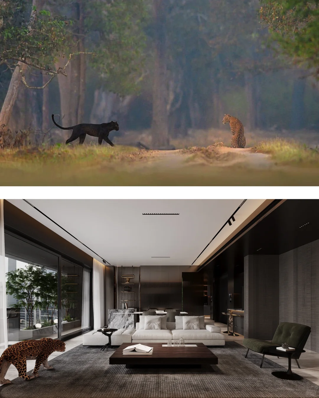 NEWCASE.温州江山云起私宅 原野的自由散漫、森林的狂野奔放,与精致的生活品质融合会是怎样的效果?...... 本案是位于江山云起的私定设计。借鉴亨利·卢梭的作画笔触,模仿狂放的姿态与精心的细致,借用轻奢风格来组建家的设计;通过阳台一侧的植被,营造密林穿行的视觉感,室内绿色家居与花豹的点缀,将狂野、轻奢完美地融合在一个空间中。 入户门厅是色彩葱郁的大理石打造。随着入户灯光点亮,绿叶装置如同垂挂清晨的露珠透过茂密树叶洒落的阳光;仿佛踏入家中即可开启一趟魔幻的丛林之旅。