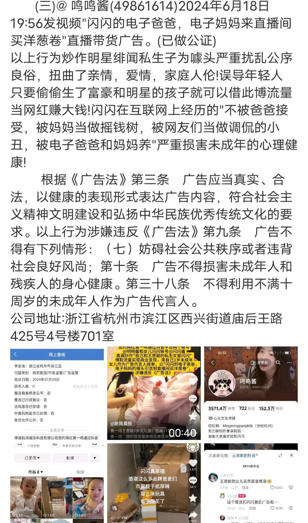 黄一鸣遭李雨婵举报,可能面临封号的风险。举报内容总结如下: 1. 黄一鸣的非婚生子的事情,已经超出了公众接受的道德边界。她不仅没有对此感到羞愧,反而以此为荣,甚至公开表示“如果你知道我女儿的爸爸是谁,你也会羡慕我的”,这样的言论带来不良价值观。 2. 黄一鸣利用自己的女儿亲生父亲的身份进行炒作,制造轰动效应,试图增加自己的粉丝和流量。“王撕葱你是个der呀”的言论,显然已经引导了错误的舆论方向。 3. 她还利用自己年仅一岁的女儿来接广告和直播带货,这无疑对儿童的健康成长构成了潜在的威胁。他声称“闪闪的电子爸爸电子妈妈们来养活闪闪”,但这种行为实际上是在利用女儿的童年为自己牟利。 4. 黄一鸣把这些本属于私人生活的问题摆到了公众面前,不仅让王家父子成为了笑柄,还给他们带来了巨大的压力。他一方面声称自己不需要钱,另一方面却又通过晒自己的家丑来向王家父子索取,这种“既要又要”的做法,反映了一种扭曲的价值观。 经过李雨婵这一番审判举报,黄一鸣凶多吉少,李雨婵曾凭一人之力,让郭有才面壁思过,让王婆找到根源,让铁头全网封禁,让涂磊面临封号,让王海为之颤抖。