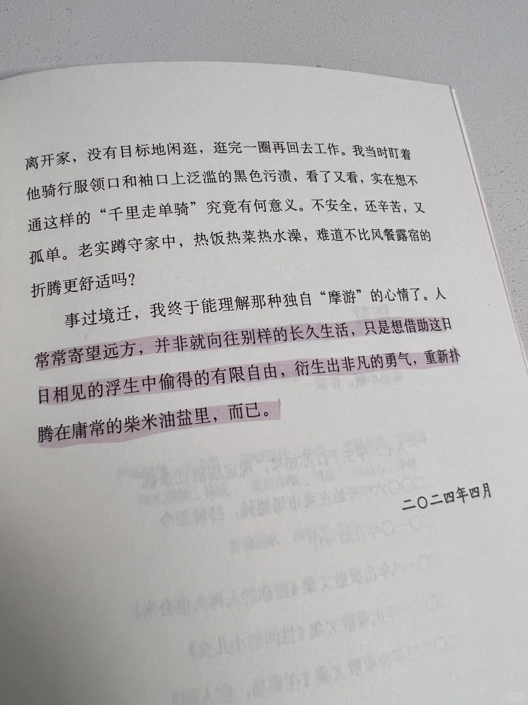 🟣人常常寄望远方,并非就向往这样的长久生活,只是想借助这日日相见的浮生中偷得的有限自由,衍生出非凡的勇气,重新扑腾在庸常的柴米油盐里,而已