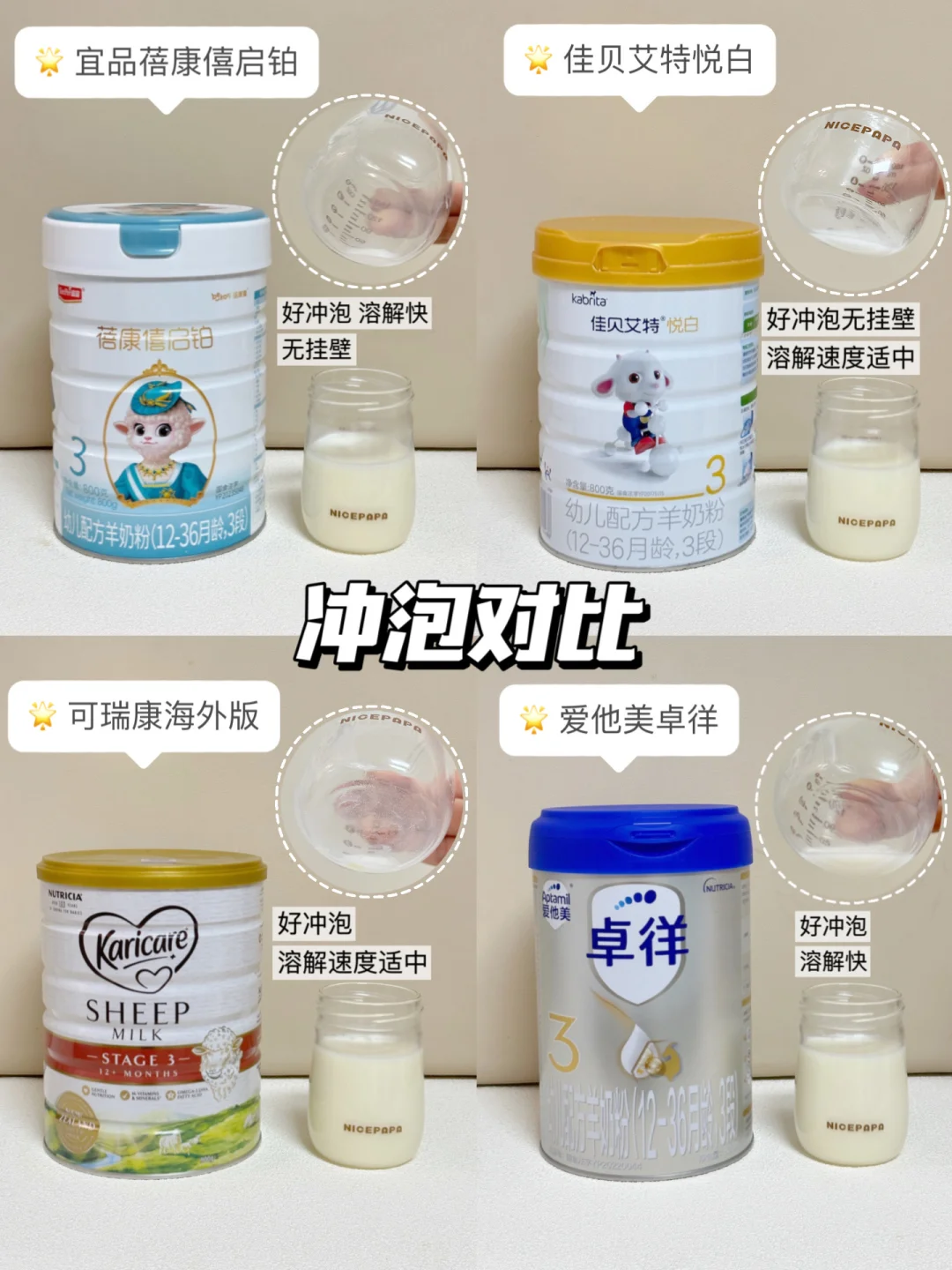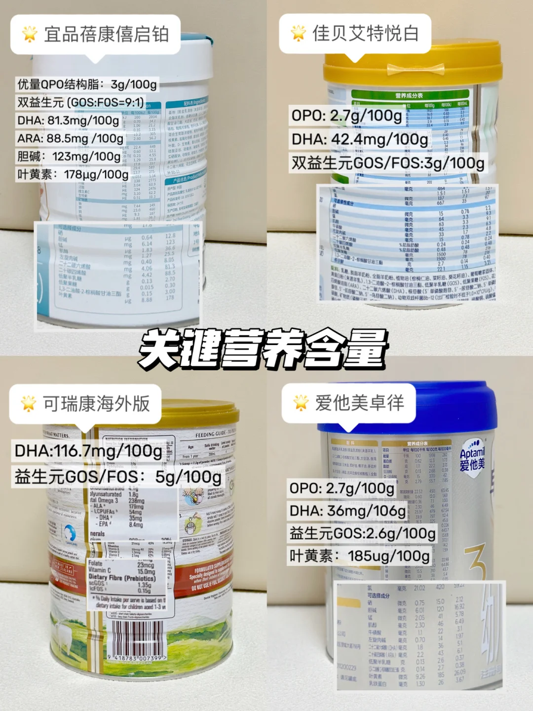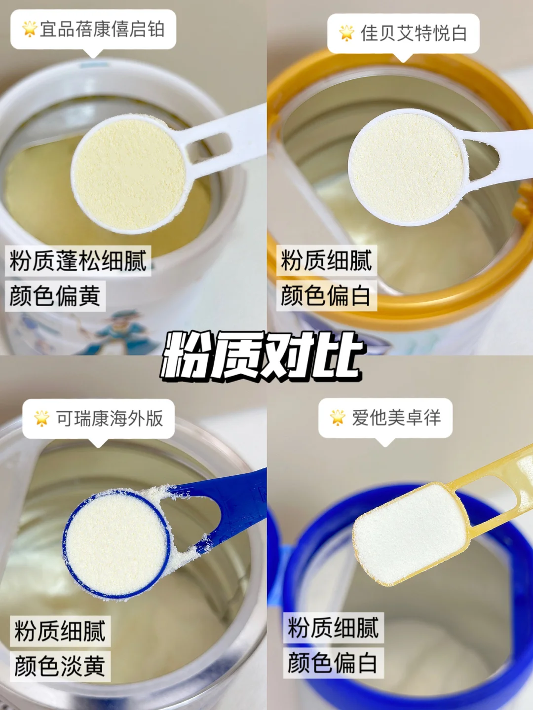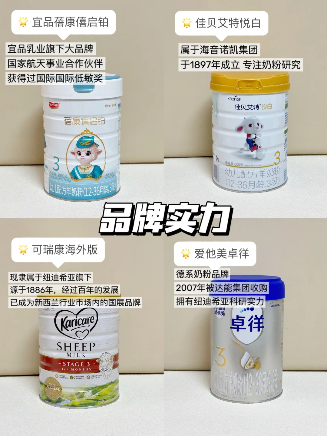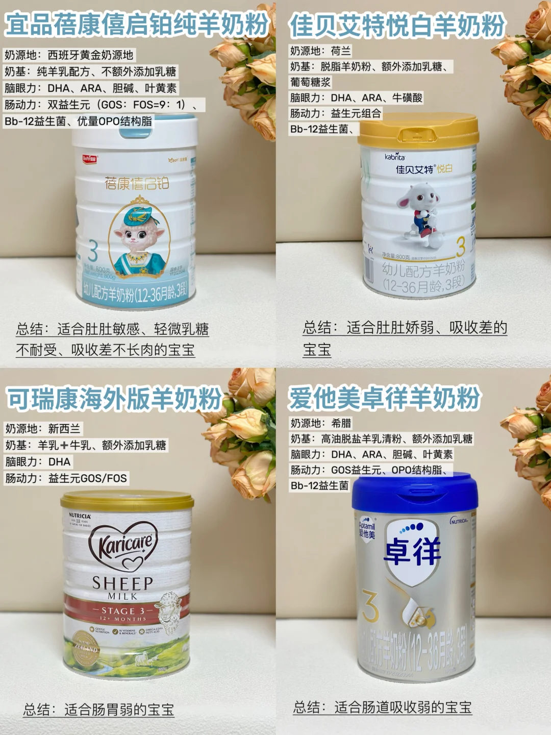 小二宝13个月的时候就给她断奶了,一开始给她换的牛奶粉,但是吸收很不好、噗噗困难,体检时大白说我家娃肚肚有点敏感,建议换更低敏亲和好吸收的奶粉试试!听说羊奶的脂肪球颗粒比牛奶还要小1/3,好吸收,还含有天然A2β-酪蛋白,更亲和宝宝的肚子,适合小敏宝! - 但是市面上的羊奶粉太多了,实在选的头大! 所以一次性买了四款口碑不错的热门羊奶粉回来测评一下,刚好也可以给家有小敏宝的姐妹们参考 ➡️测评奶粉:宜品蓓康僖启铂纯羊奶粉、佳贝艾特悦白羊奶粉、爱他美卓徉羊奶粉、可瑞康海外版羊奶粉 ➡️测评角度:品牌/奶源、营养成分、冲泡口感 - 品牌/奶源 宜品蓓康僖启铂 宜品乳业旗下大品牌,是中国航天事业合作伙伴,获得过国际低敏奖,奶源是来自西班牙黄金奶源地的纯羊乳 佳贝艾特悦白 属于海普诺凯乳业集团,奶源来自荷兰羊乳 爱他美卓徉 德国著名的美乐宝公司旗下品牌之一,奶源来自希腊羊乳 可瑞康海外版 纽迪希亚旗下著名婴幼儿奶粉品牌,奶源来自新西兰羊乳 - 核心成分 宜品蓓康僖启铂:脱盐羊乳清粉(高含量羊乳清蛋白) 佳贝艾特悦白:OPO结构脂 爱他美卓徉:双源乳铁蛋白 可瑞康海外版:DHA - 肠动力 宜品蓓康僖启铂:优量OPO结构脂、双益生元(GOS:FOS=9:1)、Bb-12益生菌 佳贝艾特悦白:OPO结构脂、双益生元GOS+FOS、Bb-12益生菌 爱他美卓徉:OPO结构脂、Bb-12益生菌、益生元GOS 可瑞康海外版:益生元GOS/FOS - 脑眼力 宜品蓓康僖启铂:DHA、ARA、叶黄素、胆碱 佳贝艾特悦白:DHA 、ARA、胆碱、牛磺酸 爱他美卓徉:DHA、ARA、叶黄素、胆碱 可瑞康海外版:DHA - 综上,我给我家宝宝选的是宜品蓓康僖启铂纯羊奶粉,它的3段羊乳清蛋白含量高达60%,与酪蛋白的配比接近亲喂,降低了宝宝肚肚的吸收压力,更好吸收!它还是从基料到辅料不含1滴牛乳的纯羊乳配方,不额外添加乳糖,还有能分解乳糖的宝藏成分ATP,哪怕宝宝有点轻微乳糖不耐也可以放心选择 口味是淡淡奶香,没有膻味,我家二宝一喝就爱上了 现在出门人家看她肉嘟嘟的小脸蛋,都说超想rua,哈哈~