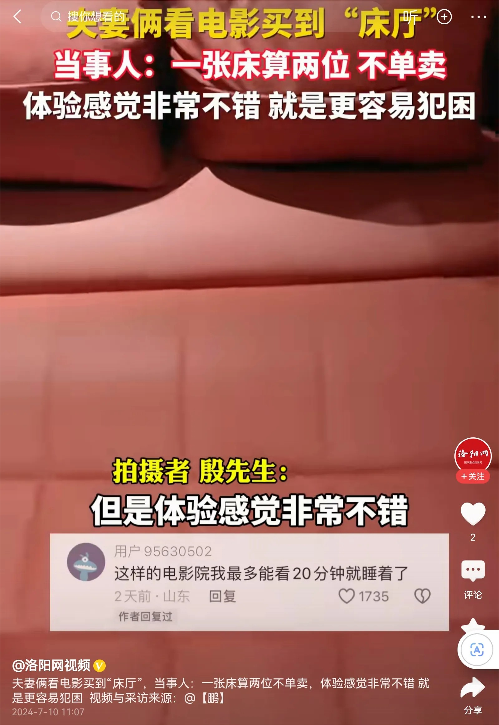 他看了整个电影院,所有的床都是双人的。也就是说,如果单人看电影,也必须买一张双人床。因为电影院不可能让两个陌生人躺在一张床上吧?