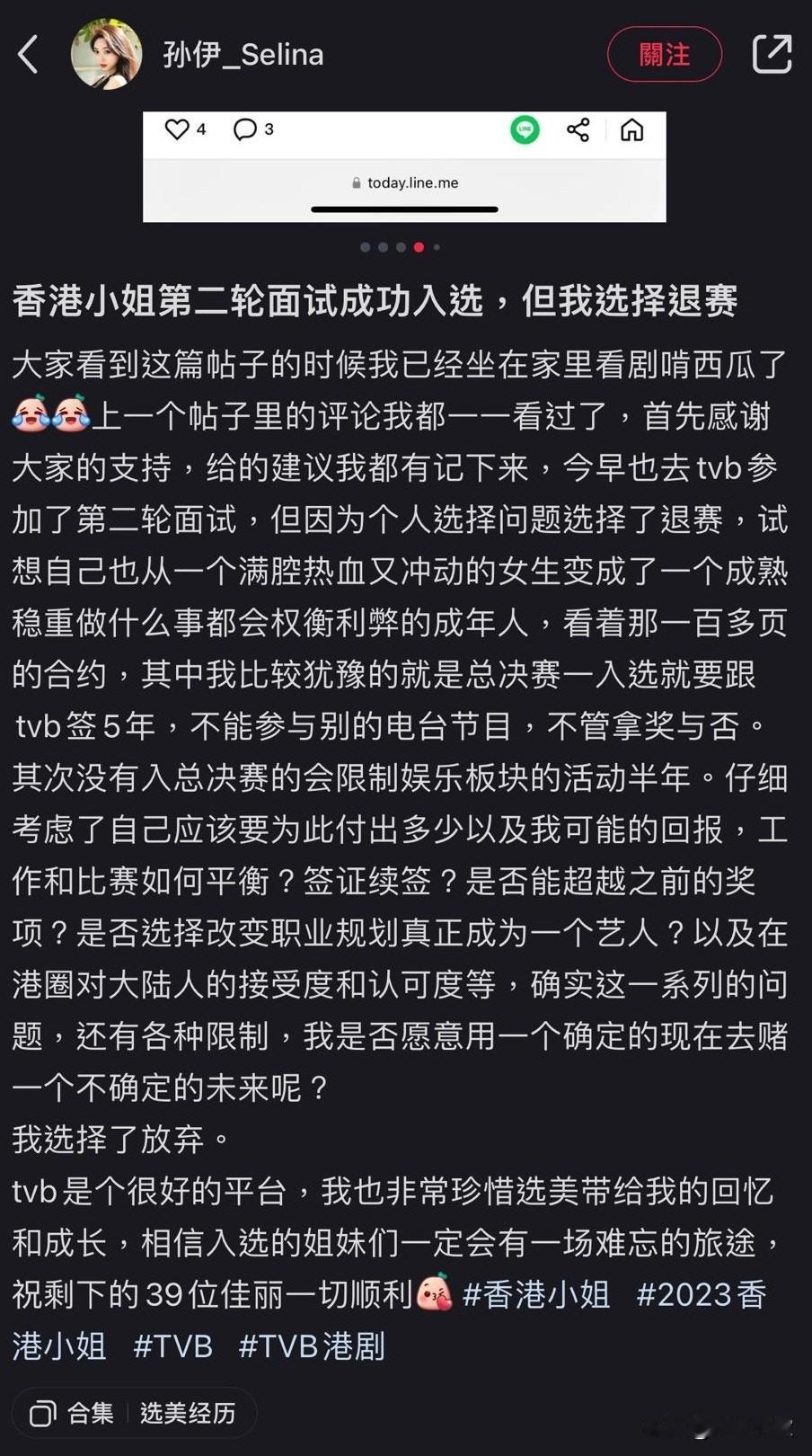 💖香港小姐|佳丽爆合约多达100页厚过电话本,一条款成退选主因! 💖无线TVB《2024年香港小姐竞选》即将举行,但赛前却连番爆出多件是非,例如来自江门的佳丽疑因挂巨型广告「投票请食海鲜」而涉版权问题,有佳丽因隐瞒已签约其他公司而涉法律责任,更有不少数佳丽爆不满「港姐合约」条款而集体,高调地宣布退出。 💖早前TVB曾因参选佳丽於小红书上指不满合约规定而退赛,疑似是因为合约条件「太辣」所致,当中更有佳丽表示被合约吓怕而退出。有关「港姐合约」当中的条款,其实以往几届都时有听闻,例如入围之前,佳丽们就已经需要与TVB签约5年,应允就算之后落选后都会「被绑死」,不得在TVB以外娱乐平台工作。因此,某些打算参选「港姐」後利用及名气再谋其他发展的佳丽,如意算盘就打不响了。 💖上年退选的孙伊曾写下长文,解决退赛的原因,坦言:「试想自己也从一舍满腔热血又冲动的女生,变成了一个成熟稳重做什么事都会权衡利弊的成年人。」当中她指出,原来TVB给她们签的合约多达一百多页,而且总决赛一入选就要跟TVB签5年,不能参加其他电视台的节目,也不管拿奖与否,而且,没有进入总决赛的也需要限制娱乐活动半年。 💖最后,孙伊表示经考虑後才决定退出,她也说:「我是否愿意用一个确定的现在去赌一个不确定的未来?」#夏日生活打卡季#
