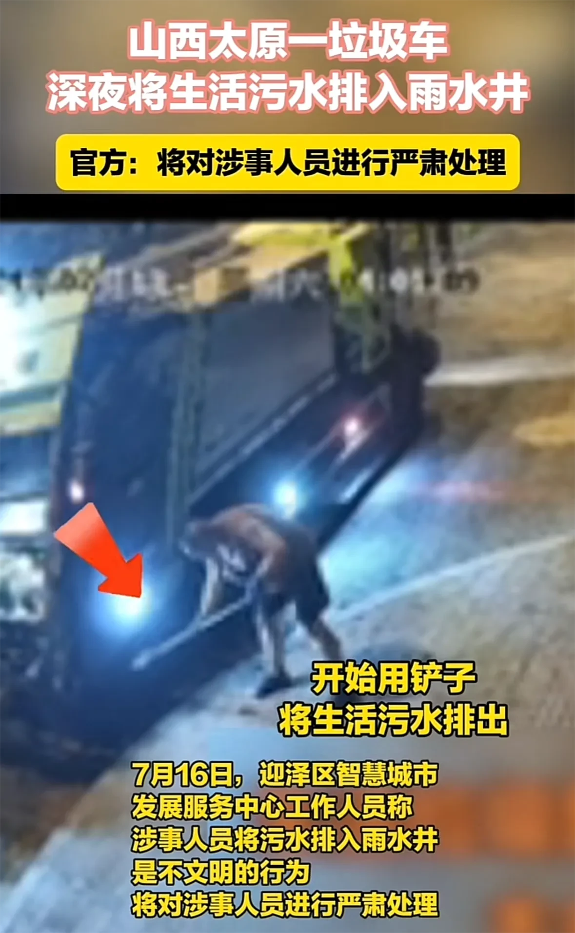 山西太原一垃圾车深夜将生活污水排入雨水井,排污后偷偷冲洗地面。 一男子引导垃圾车