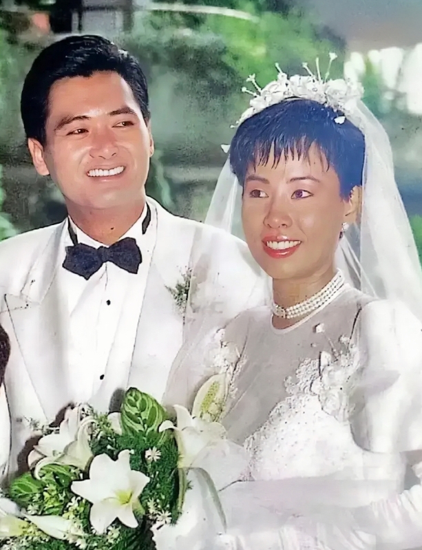 1987年,新加坡香格里拉酒店,周润发的新婚照。镜头下的周润发身穿白色西装,英俊潇洒,风流倜傥。他的妻子陈荟莲身穿婚纱,手捧鲜花,留着短发。虽然她相貌平平,但她身上的婚纱价值不菲,是新艺城设计师莎莉的心血结晶。 陈荟莲比周润发小四岁,是新加坡富商陈守林的女儿,雷厉风行的她,小小年纪便积累了上亿资产。婚后的夫妻二人十分恩爱,虽没有陈荟莲没有为他生下一儿半女,但发哥依然对她百般体贴,直言对方是自己这辈子最重要的人。