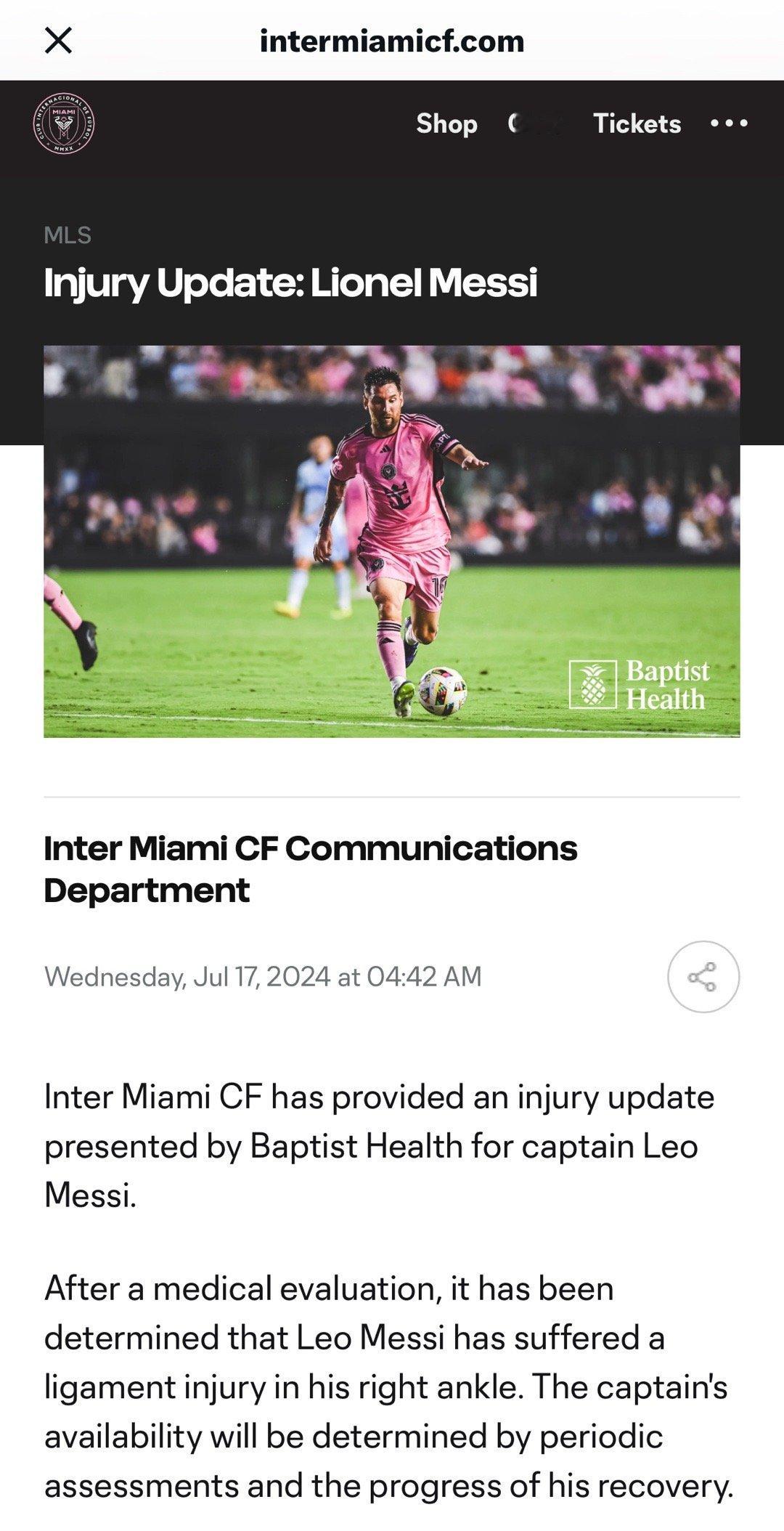 迈阿密国际官方:经过医疗评估,确定里奥·梅西的右脚踝韧带受伤。 队长能否出战将根据定期评估和他的恢复情况而定。