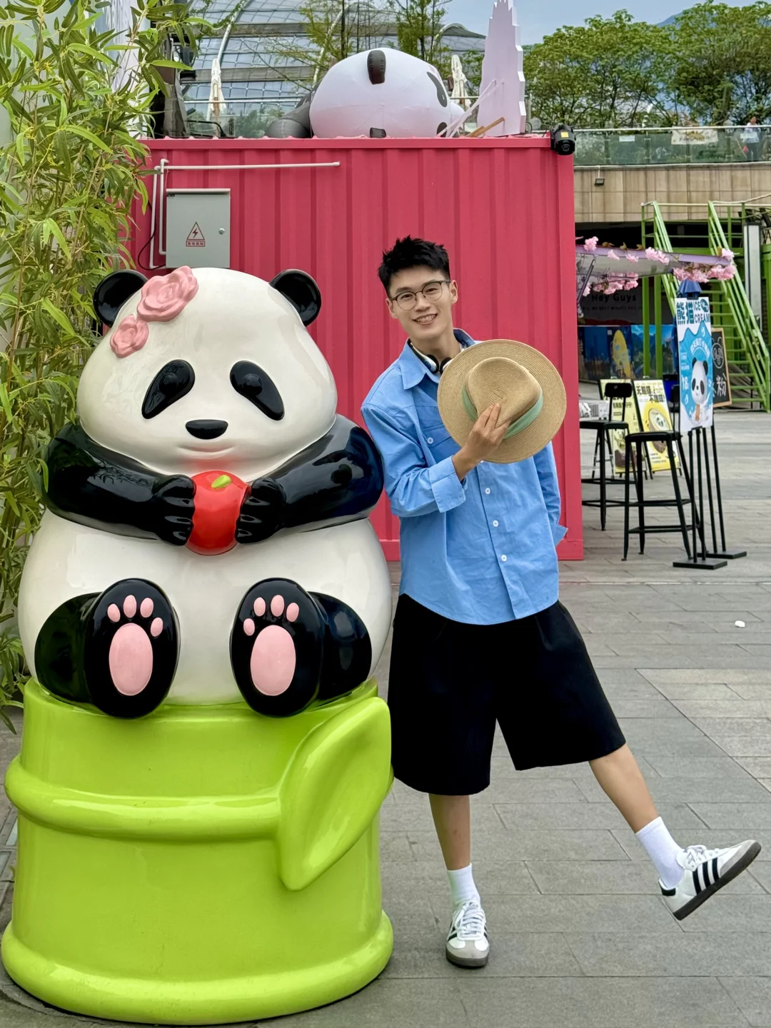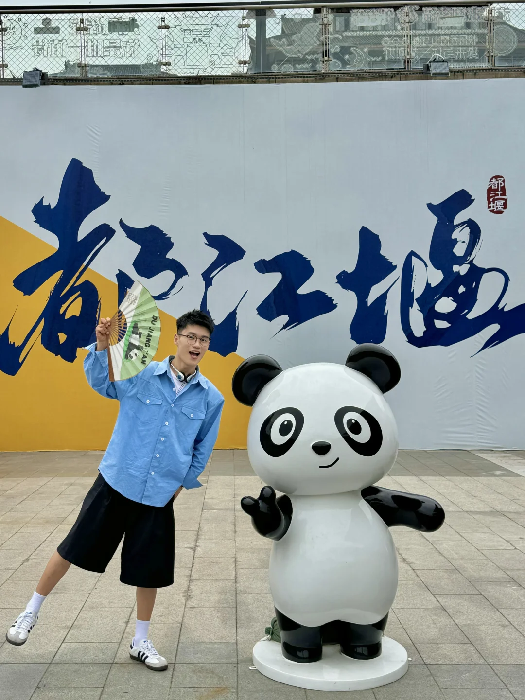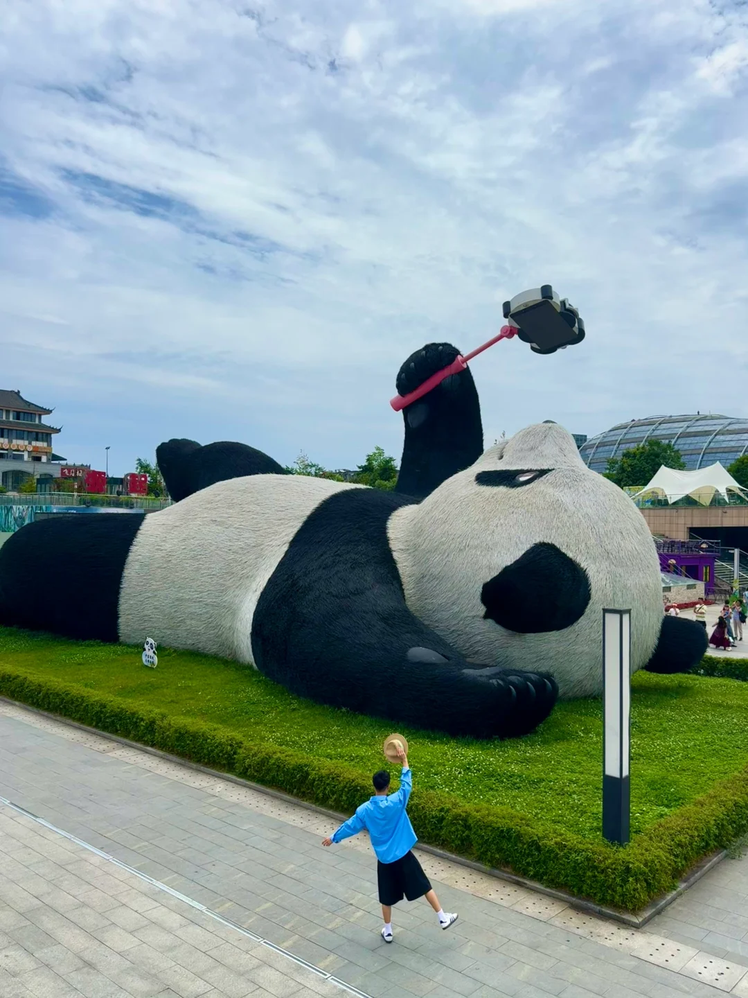 出了高铁就能看到一只慵懒的自拍大熊猫装置,真的巨出片,广场上还有“都江堰”字的墙,熊猫花花雕塑都适合拍照!
