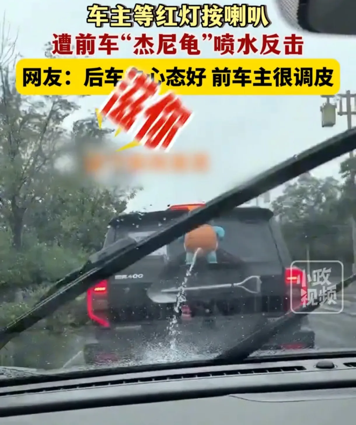 视频中,一位车主在等待红灯时因前车起步稍慢而按响了喇叭,没想到前车车顶突然伸出一个形似“杰尼龟”的喷水装置,直接对准后车车窗喷出了一股水流。这一幕被后车行车记录仪记录并上传至网络,迅速成为热门话题。