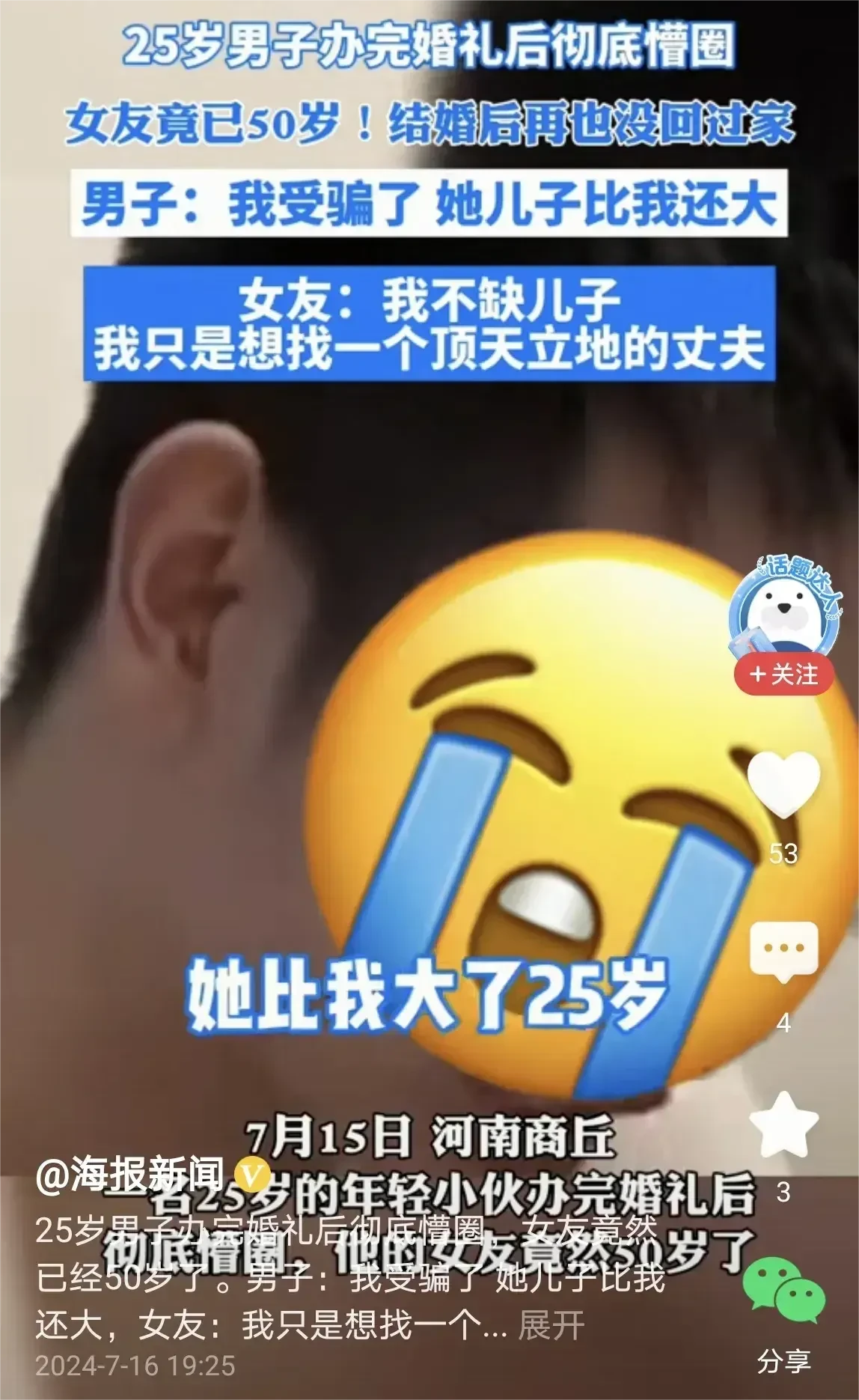 太奇葩了,小伙子婚礼都办了,才知道自己的新娘50岁了,不知道他们俩当初是怎样谈恋爱的?