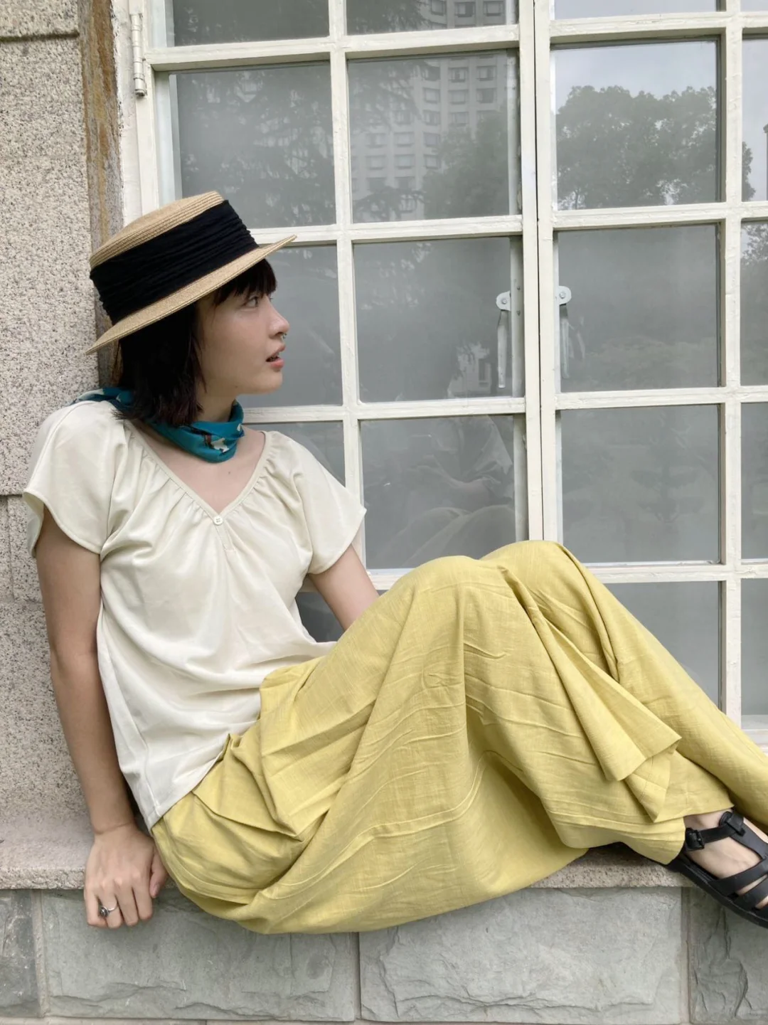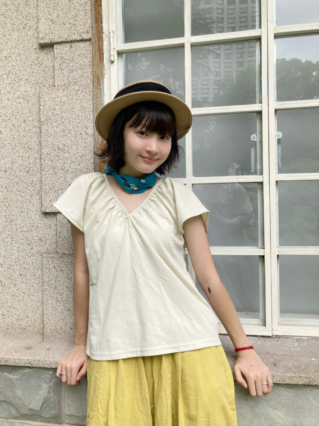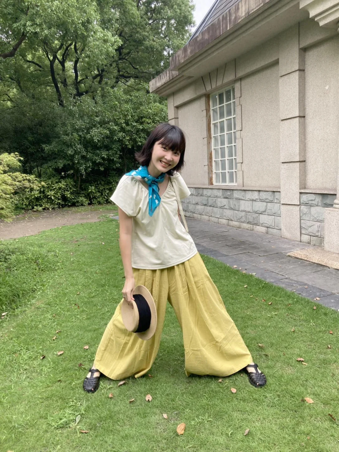 简单舒服的上衣搭配宽松的黄绿色棉麻面料的阔腿裤