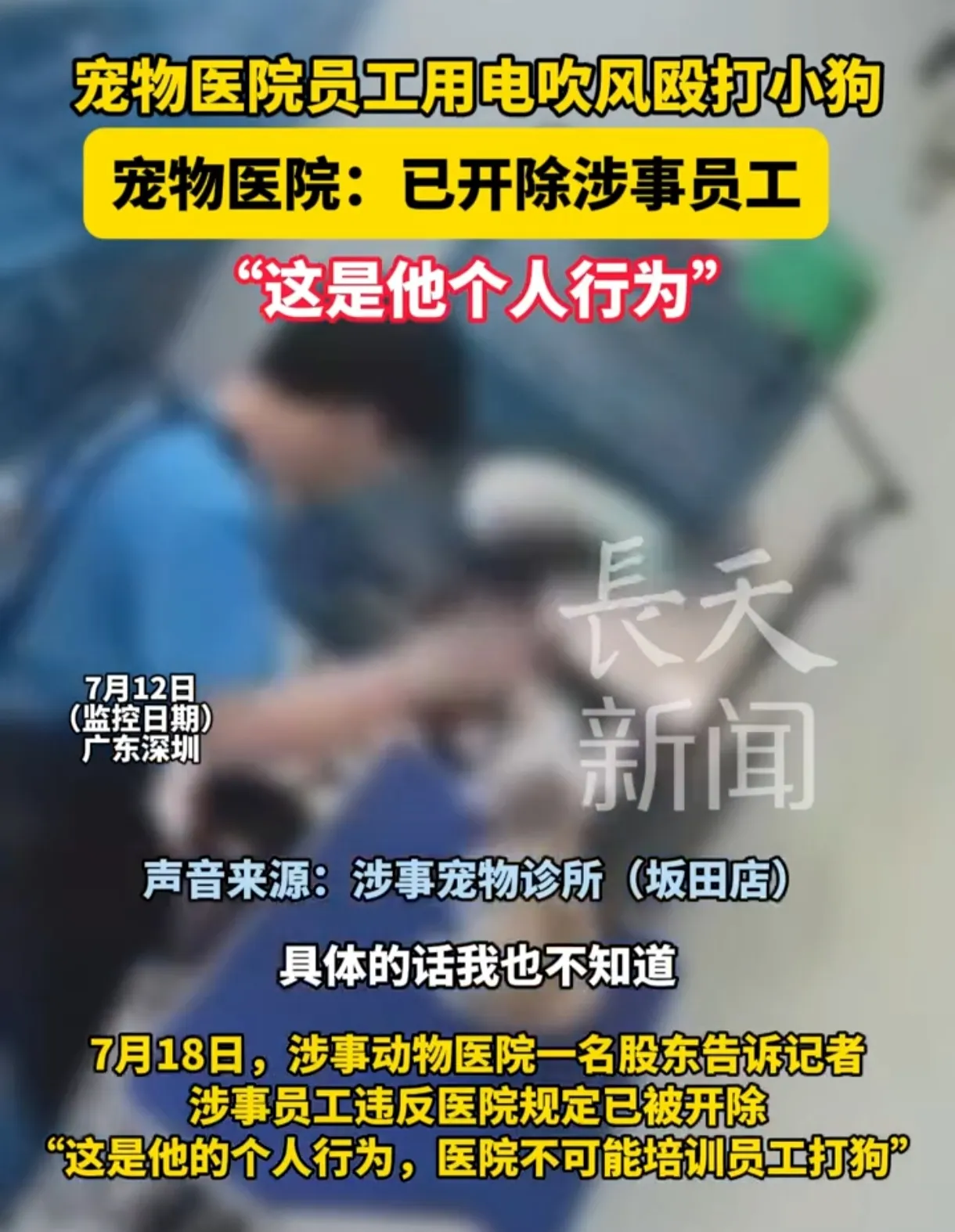 深圳某宠物医院近日发生一起令人发指的事件!监控视频曝光,一名员工竟用电吹风对小狗实施暴行,将其面部猛烈吹风至倒地抽搐,场面惨不忍睹!