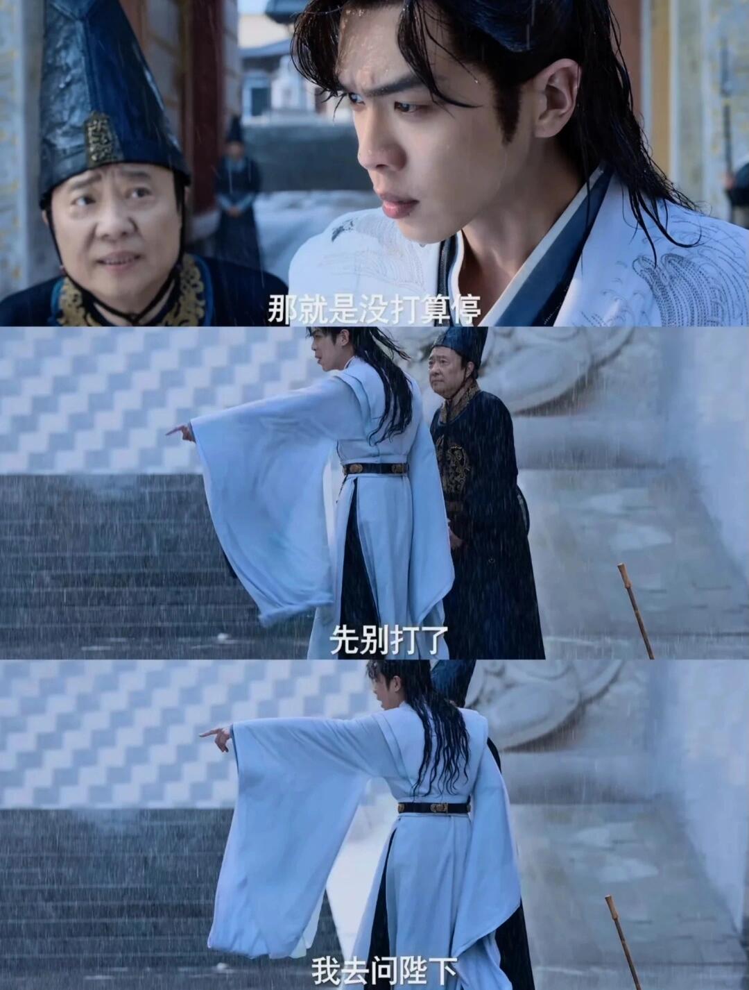 范闲在雨中飞奔赶来,看到这一幕满眼震惊,他想帮他,却无能为力。他实在看不过去了,问什么时候能停,候公公却问庆帝原话是啥?