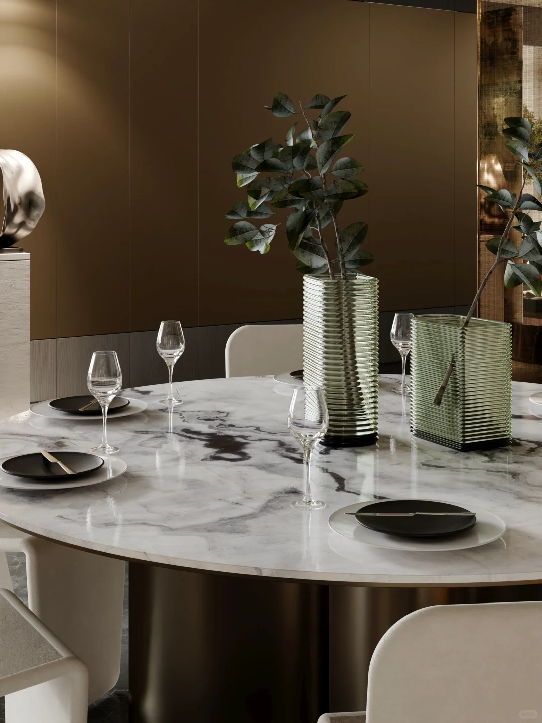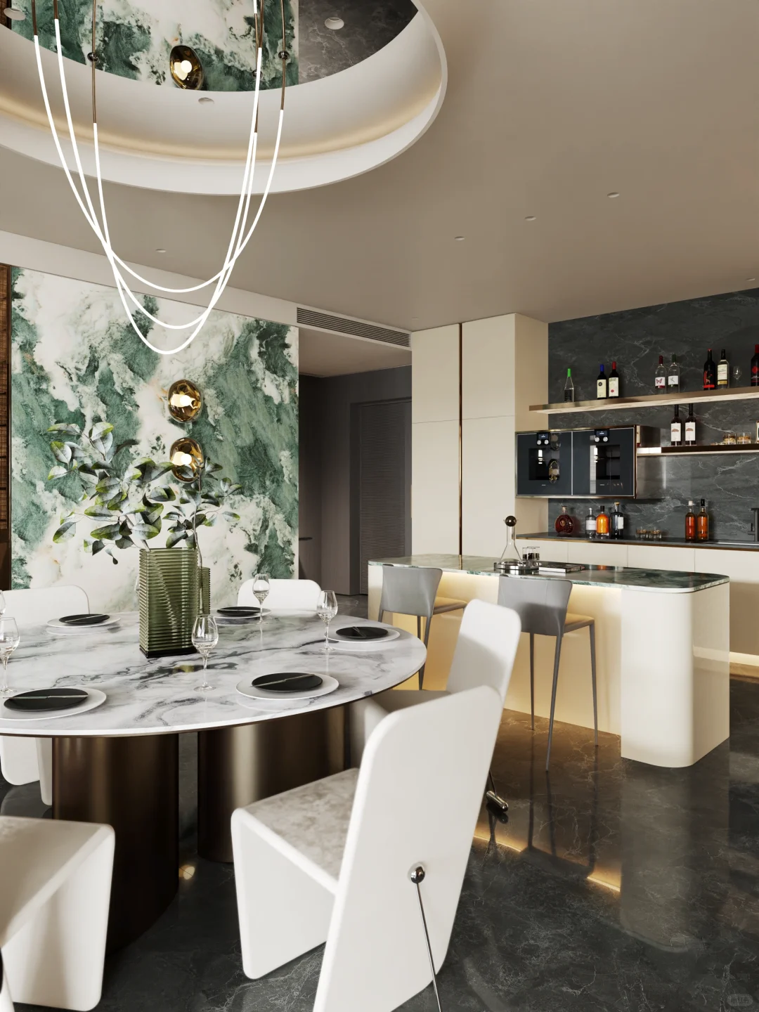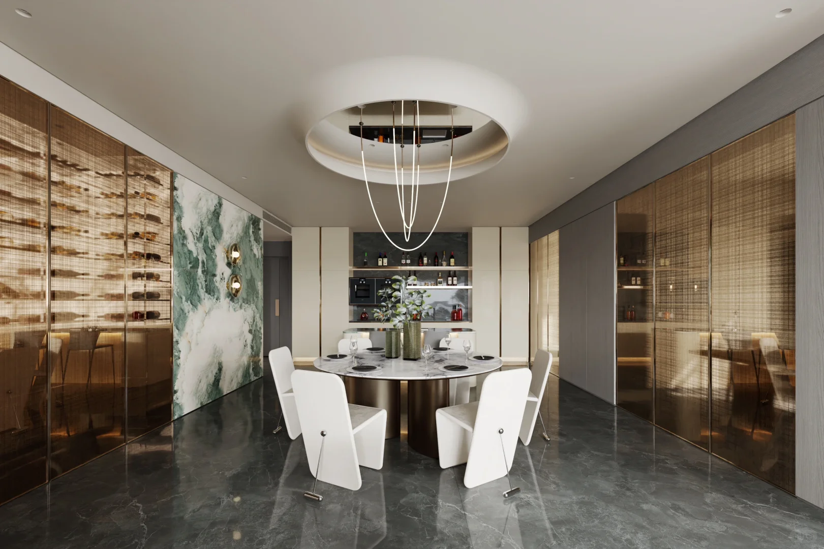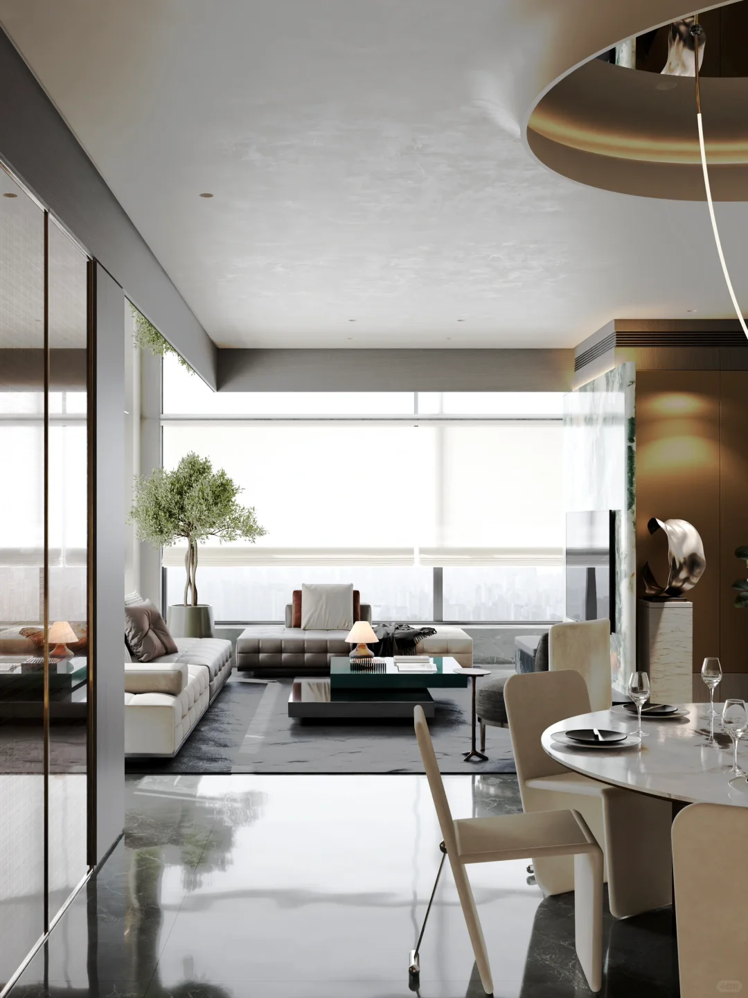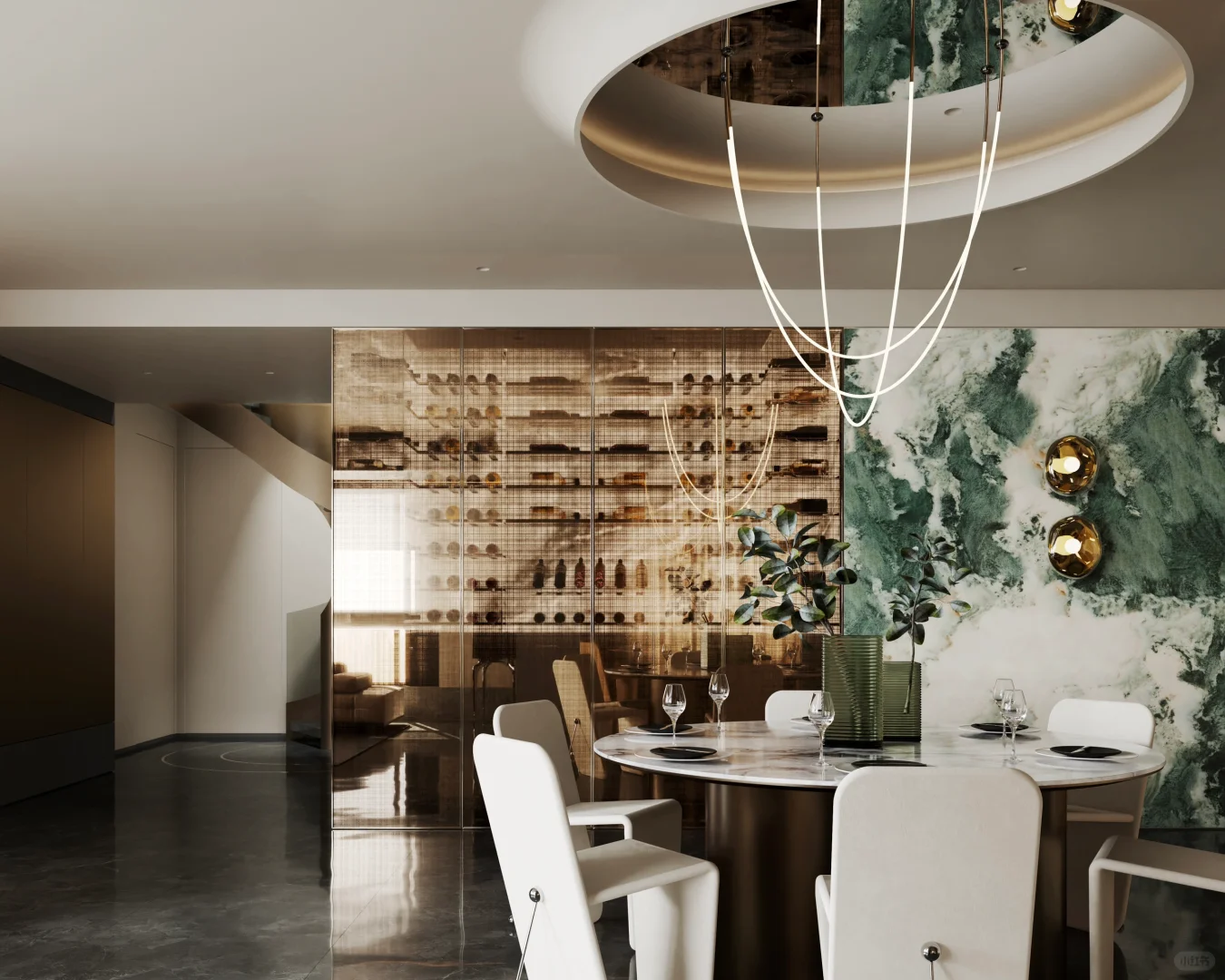 1⃣️餐厅顶面的艺术吊顶设计成了摩登风格的圆形镜面,搭配更有流线型的艺术吊灯。当灯光亮起,艺术感从上而下涌入空间中。