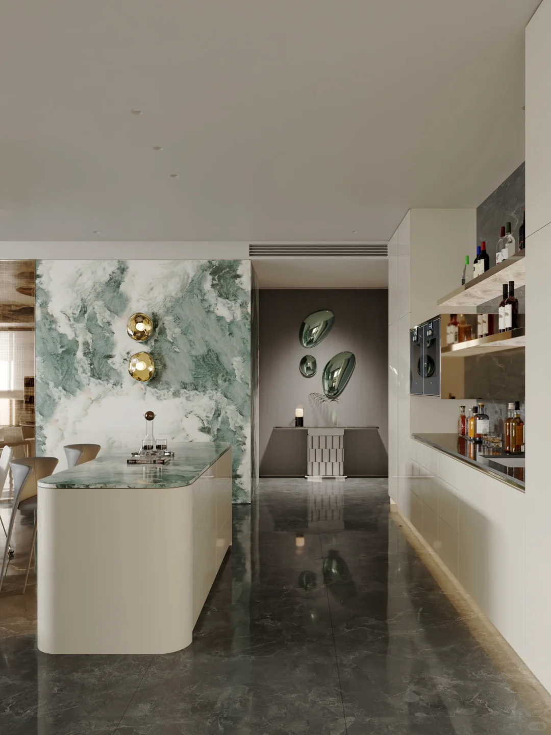 2⃣️餐厅走道墙壁是白绿色大理石,透着张扬的色系更显奢华。沿着餐厅走道摆放的酒柜则是半透玻璃的材质,棕色的金属边条搭配,藏酒其中更清晰而醒目。