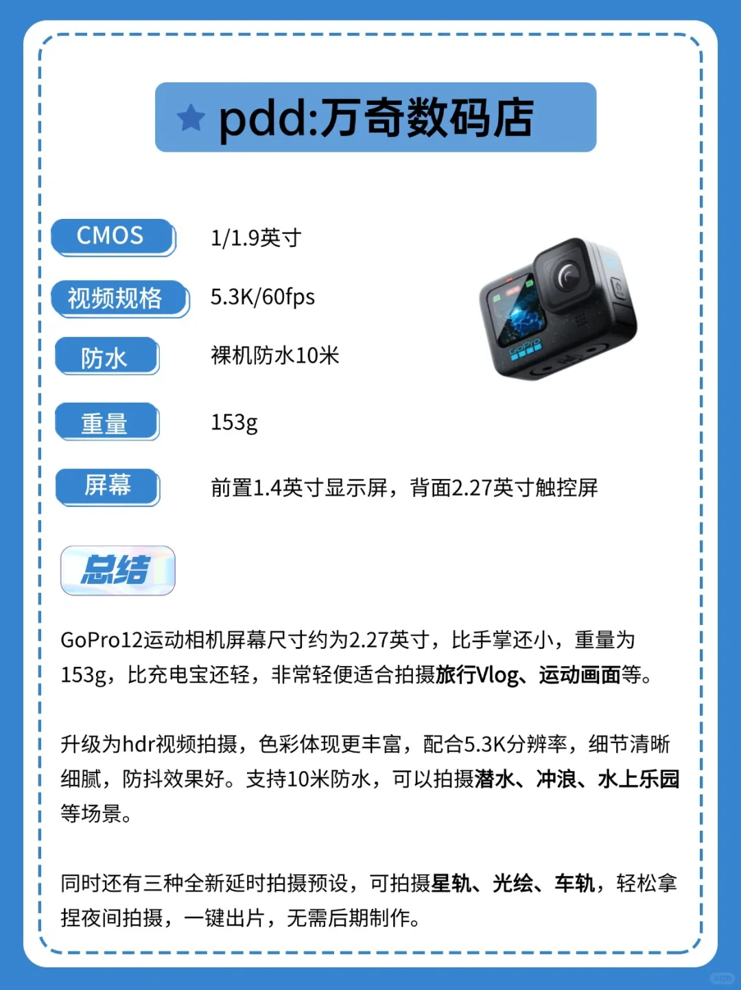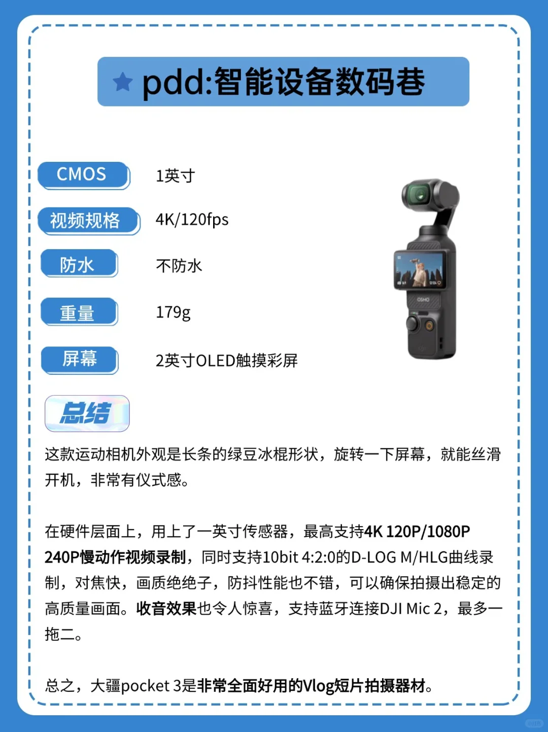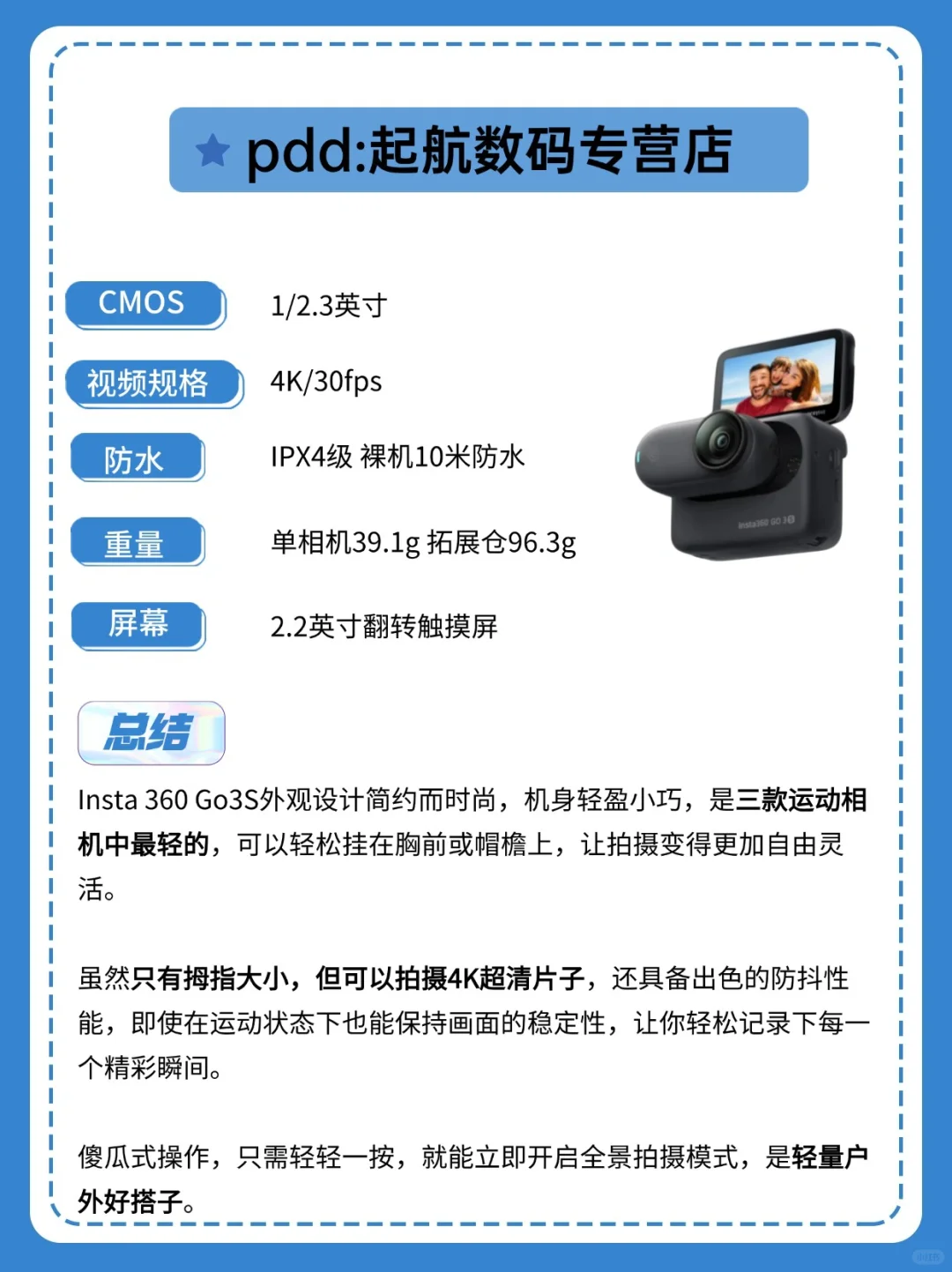 现在运动相机越来越受到博主和自媒体人的喜欢,尤其是喜欢运动、旅行、探店博主,几乎是人手一台。今天推荐三款我用过的运动相机,希望能帮到你。 1⃣GoPro12 pdd:万奇数码店 这款运动相机屏幕尺寸约为2.27英寸,比手掌还小,重量为153g,比充电宝还轻,非常轻便适合拍摄旅行Vlog、运动画面等。 拍摄的视频画面细节清晰细腻,防抖效果好。有三种全新延时拍摄预设,可拍摄星轨、光绘、车轨,轻松拿捏夜间拍摄,一键出片,无需后期制作。 2⃣Insta 360 Go3S pdd:起航数码专营店 外观设计简约而时尚,机身轻盈小巧,是三款运动相机中最轻的,可以轻松挂在胸前或帽檐上,让拍摄变得更加自由灵活。 虽然只有拇指大小,但可以拍摄4K超清片子,还具备出色的防抖性能,即使在运动状态下也能保持画面的稳定性,让你轻松记录下每一个精彩瞬间。 傻瓜式操作,只需轻轻一按,就能立即开启全景拍摄模式,是轻量户外好搭子。 2⃣大疆pocket 3 pdd:智能设备数码巷 这款运动相机外观是长条的绿豆冰棍形状,旋转一下屏幕,就能丝滑开机,非常有仪式感。 在硬件层面上,用上了一英寸传感器,最高支持4K 120P/1080P 240P慢动作视频录制,对焦快,画质绝绝子,防抖性能也不错。 工欲善其事,必先利其器,如果你想做自媒体,追求一定的拍摄质量和便携度,最好还是选择专业的拍摄设备,以上三款很适合户外vlog拍摄!