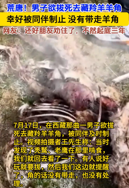 西藏那曲,男子和朋友发现了一只死去的藏羚羊,顿时玩心大起,就想把羊角掰下来,朋友看到后,脸色都变了,立马上前阻止!从而避免了一场灾祸,网友:还好没掰下来,不然至少3年起步!