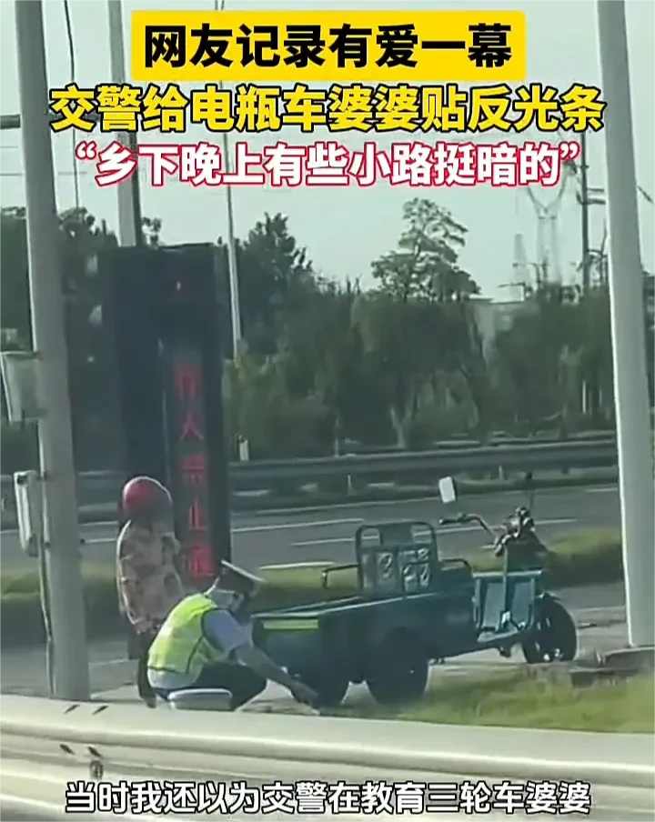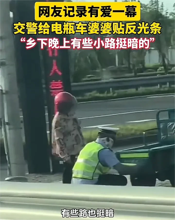 近日,浙江嘉兴一名女子开车经过某路口时,看到一位交警顶着37度的高温,正在给骑电瓶车的婆婆贴反光条。该女子表示,这边有些婆婆结束田间劳作后,都是摸黑回家,夜间驾驶比较危险,交警的举动很暖心。