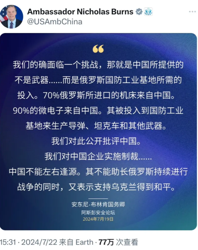 美国驻华大使伯恩斯昨天(7月22日)转发布林肯的涉华言论:“我们的确面临一个挑战,那就是中国所提供的不是武器……而是俄罗斯国防工业基地所需的投入。70%俄罗斯所进口的机床来自中国。90%的微电子来自中国。其被投入到国防工业 基地来生产导弹、坦克车和其他武器。 我们对此公开批评中国。我们对中国企业实施制裁......中国不能左右逢源。其不能助长俄罗斯持续进行战争的同时,又表示支持乌克兰得到和平。”