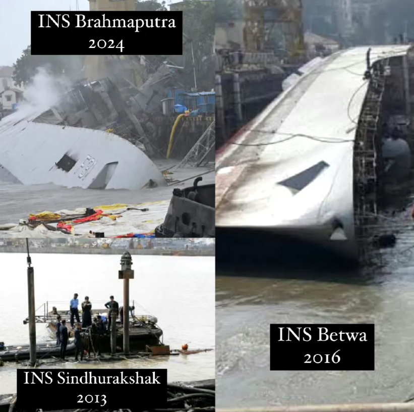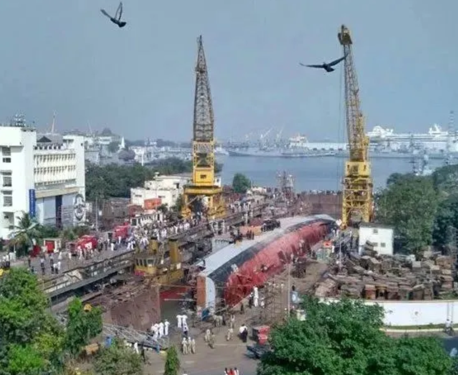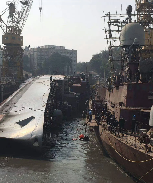 7月22日,印度海军“布拉马普特拉”号(F31)导弹护卫舰在孟买造船厂维修时,发生火灾,翻沉在港口里。