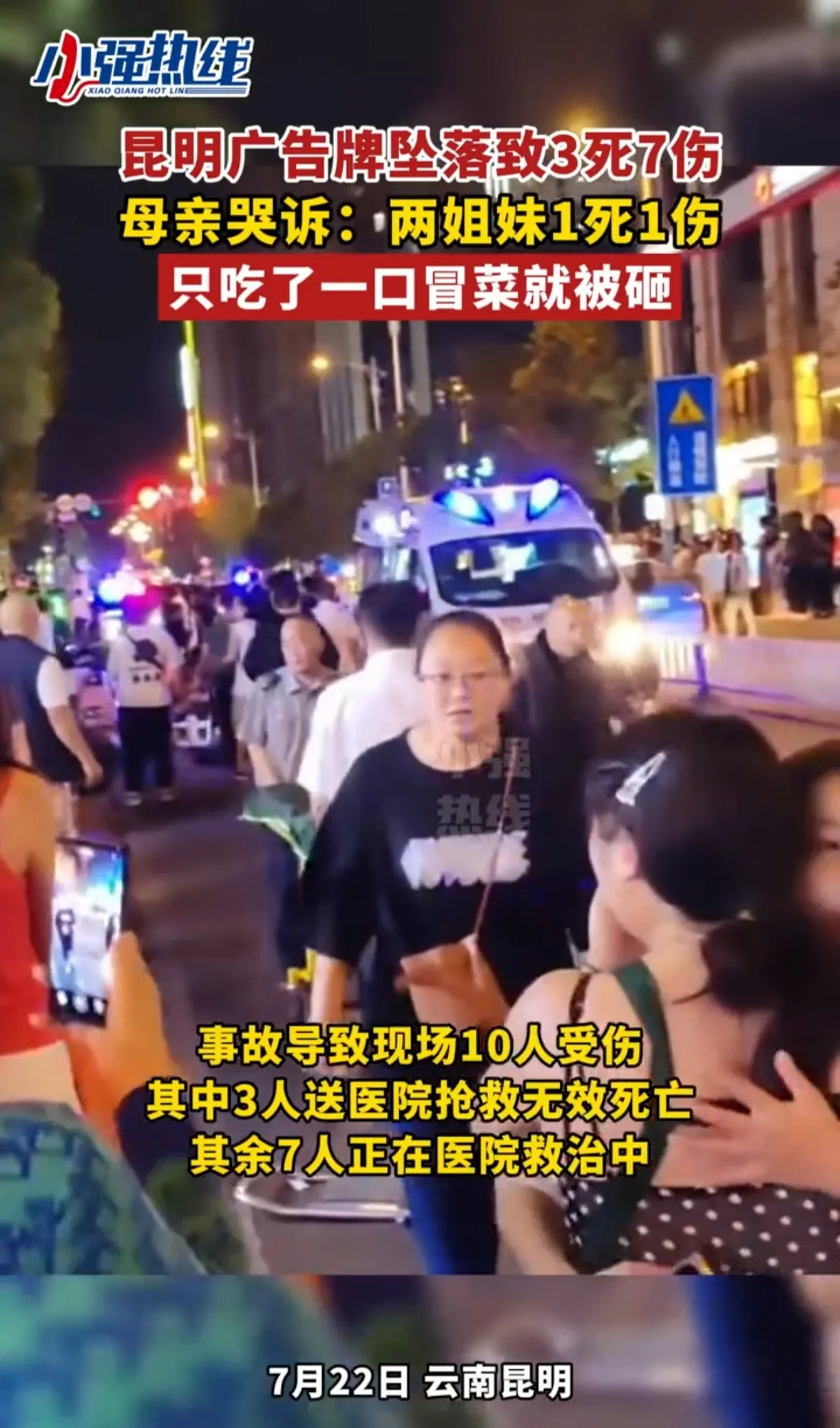 云南昆明金江路突发惨剧,一块广告牌从天而降,瞬间夺走三人生命,七人重伤。其中,一对无辜姐妹更是遭遇重创,6岁姐姐不幸离世,4岁妹妹仍在ICU生死未卜。母爱泣血,现场令人心碎。