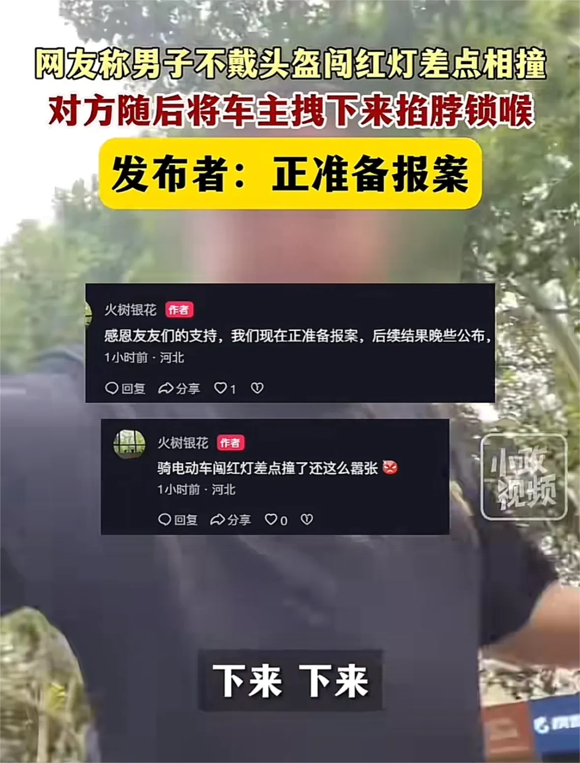 车主称男子不戴头盔闯红灯差点相撞,对方将车主拽下来掐脖锁喉。 河北邯郸,男子停在