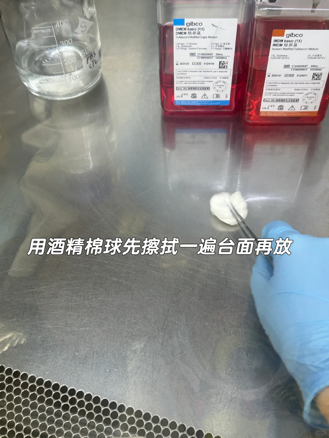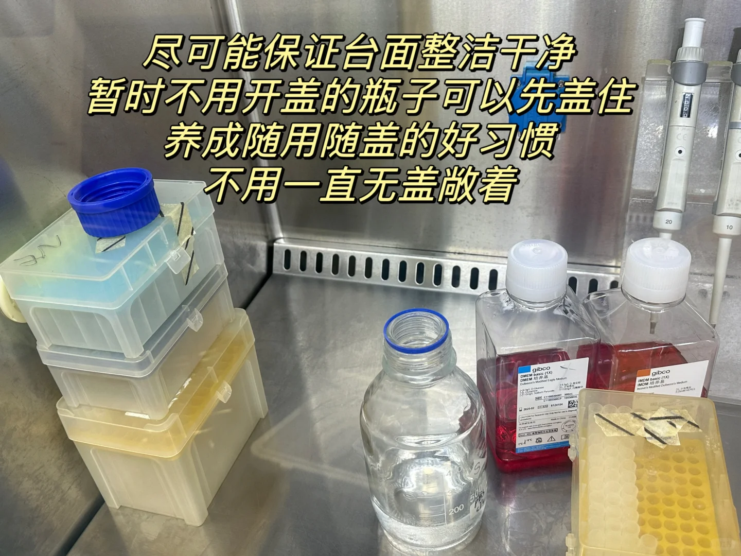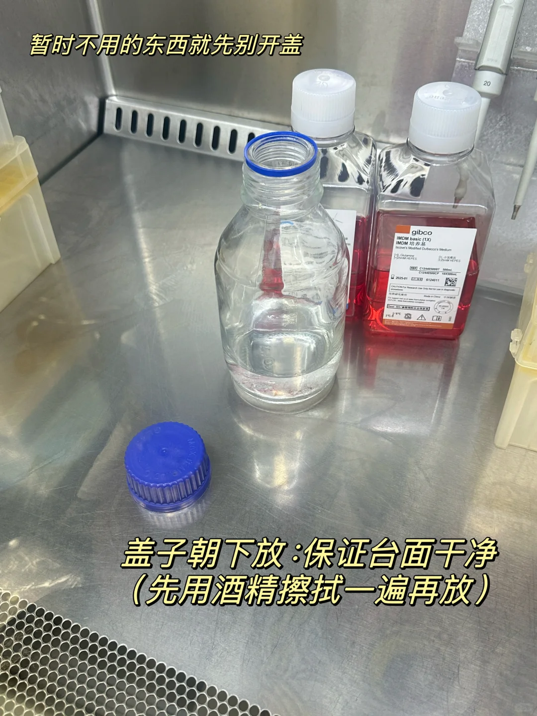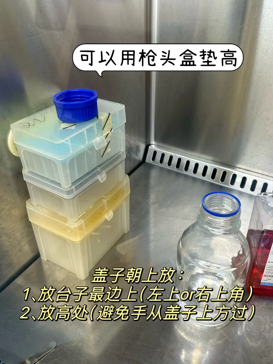 之前遇到过师弟师妹把一整瓶培养基污染了,但是本人并不知道,从而导致所有细胞都污染💥 瓶口是最容易污染的地方,处理细胞时,培养基还有一些无菌玻璃瓶的盖子如何放置可以尽可能避免污染❓盖子应该朝上放还是朝下放呢❓ 其实都可以!但也有一些小tips可供参考哦~ ✅瓶盖朝上放: 1、盖子最好放在台面的最角落位置,尽可能避免胳膊和手在盖子附近来回过,左上角or右上角都可以,个人喜欢放左上角,因为右上角放垃圾桶。 2、盖子朝上放时最好放高处,可以用枪头盒垫高以后放上去。 ✅盖子朝下放: 先用酒精棉球擦拭干净台面,再把瓶盖倒扣在台面上即可,不会污染。 ps: 1、如果细胞污染了,为了避免所有细胞都阵亡的情况,可以先空培养一下培养基,如果没有污染再接着用哦,可能就是操作or枪头等污染的问题了,直接把污染的细胞扔掉即可。 2、无菌瓶or培养基用完拧紧后,瓶口处可以缠点封口膜再放回4度。 ㊗️大家的细胞永不污染!!!
